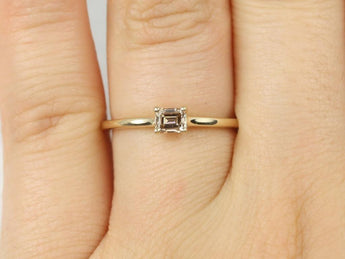 The Sahara ring showcases a striking 0.30ct cognac diamond set in a distinctive east-west solitaire design. The emerald cut diamond reveals warm desert-inspired tones while the east west setting creates a modern, minimalist silhouette. Crafted in 14kt yellow gold and ready to ship after sizing, this handcrafted piece offers refined simplicity with unique character. Wear it alone for understated elegance or layer it with other rings for a distinctive stacked look.