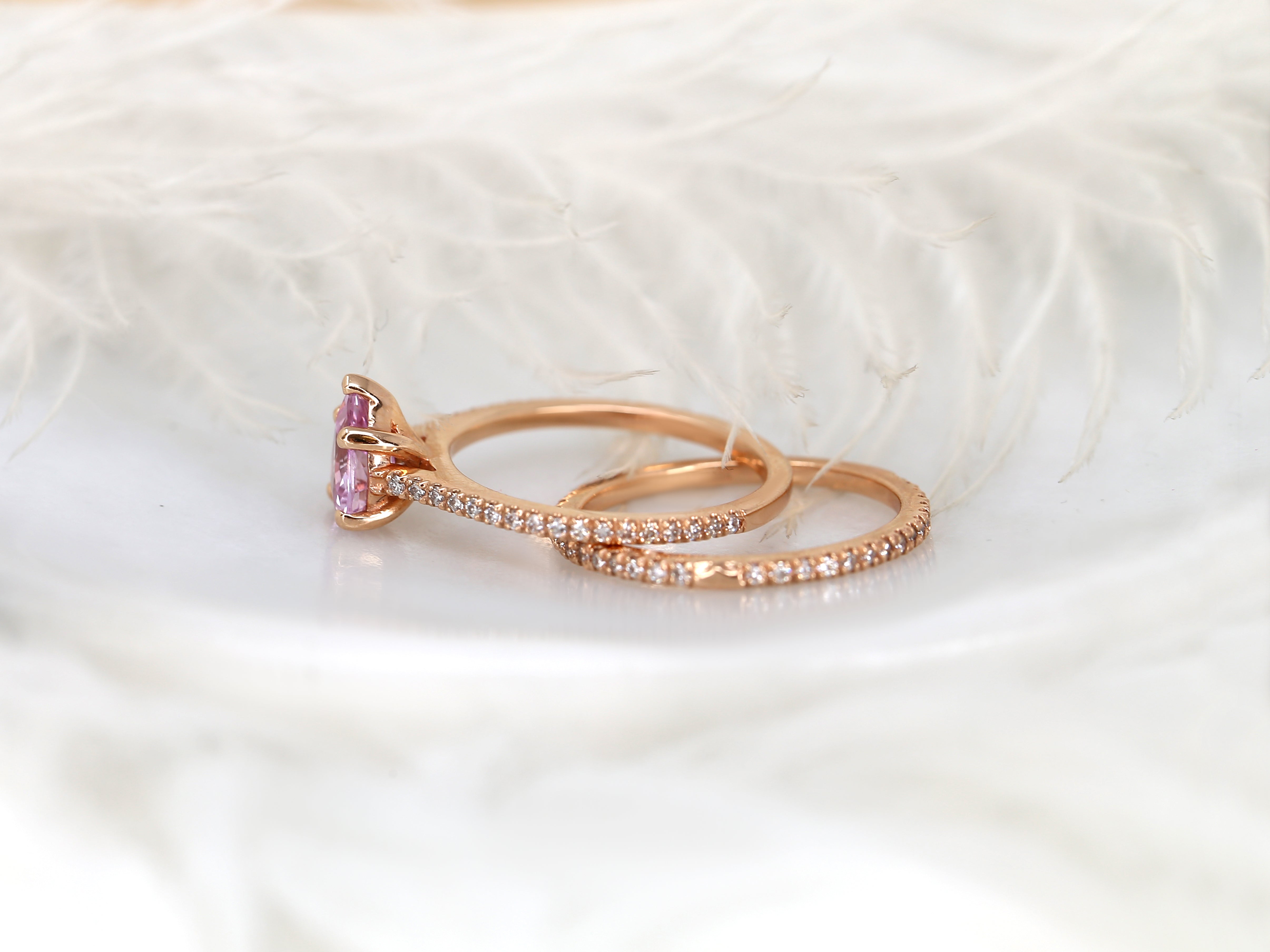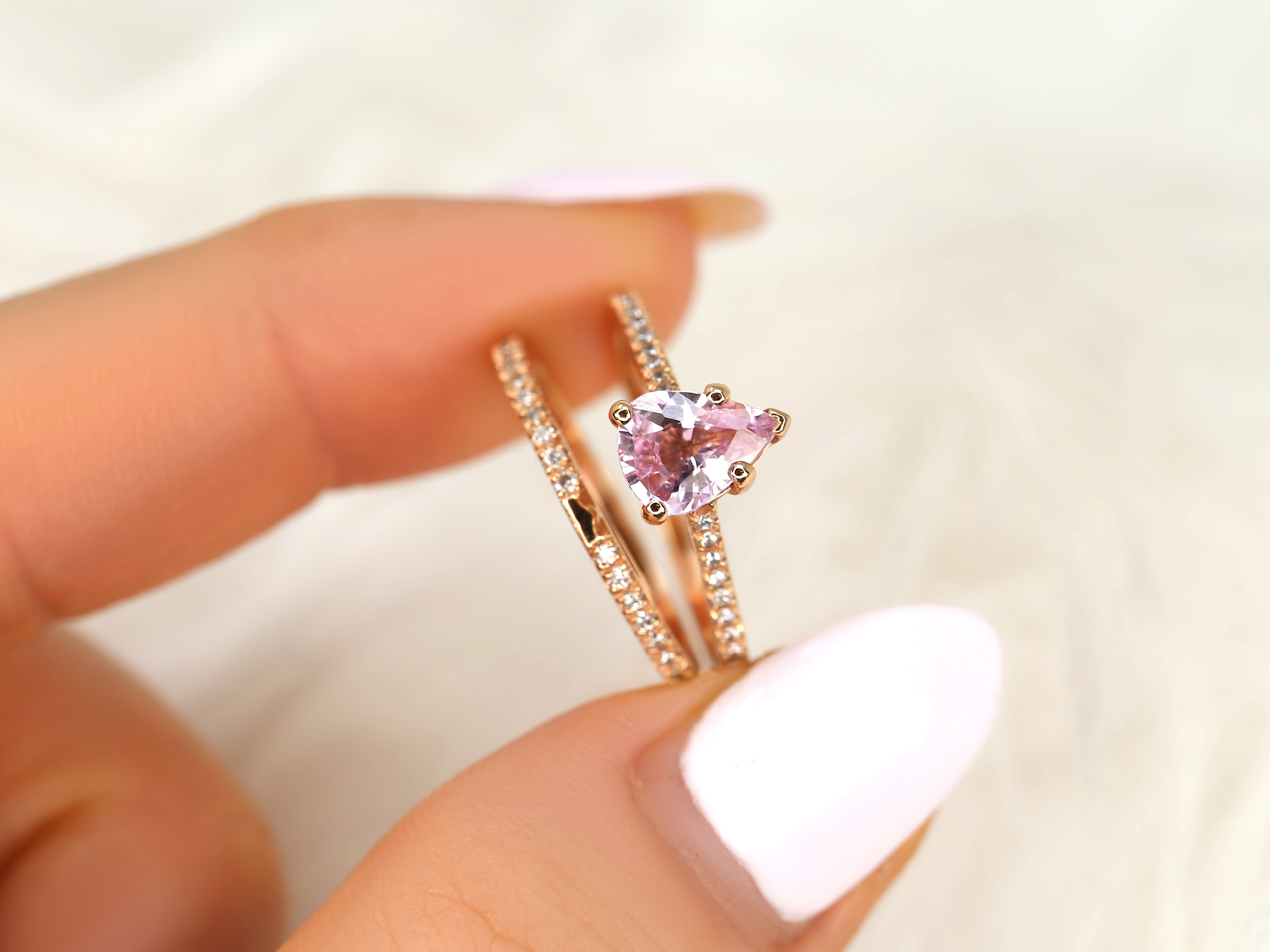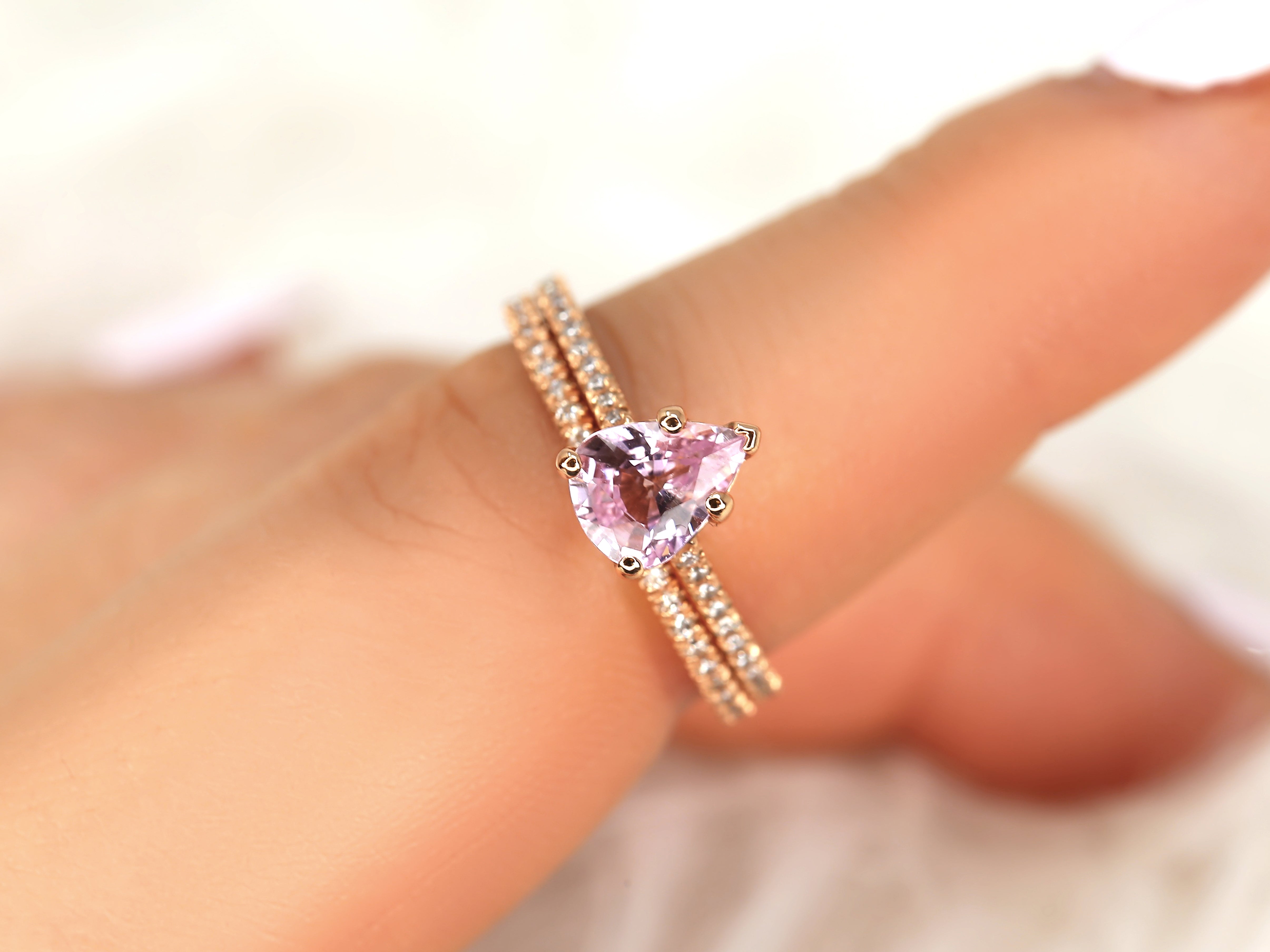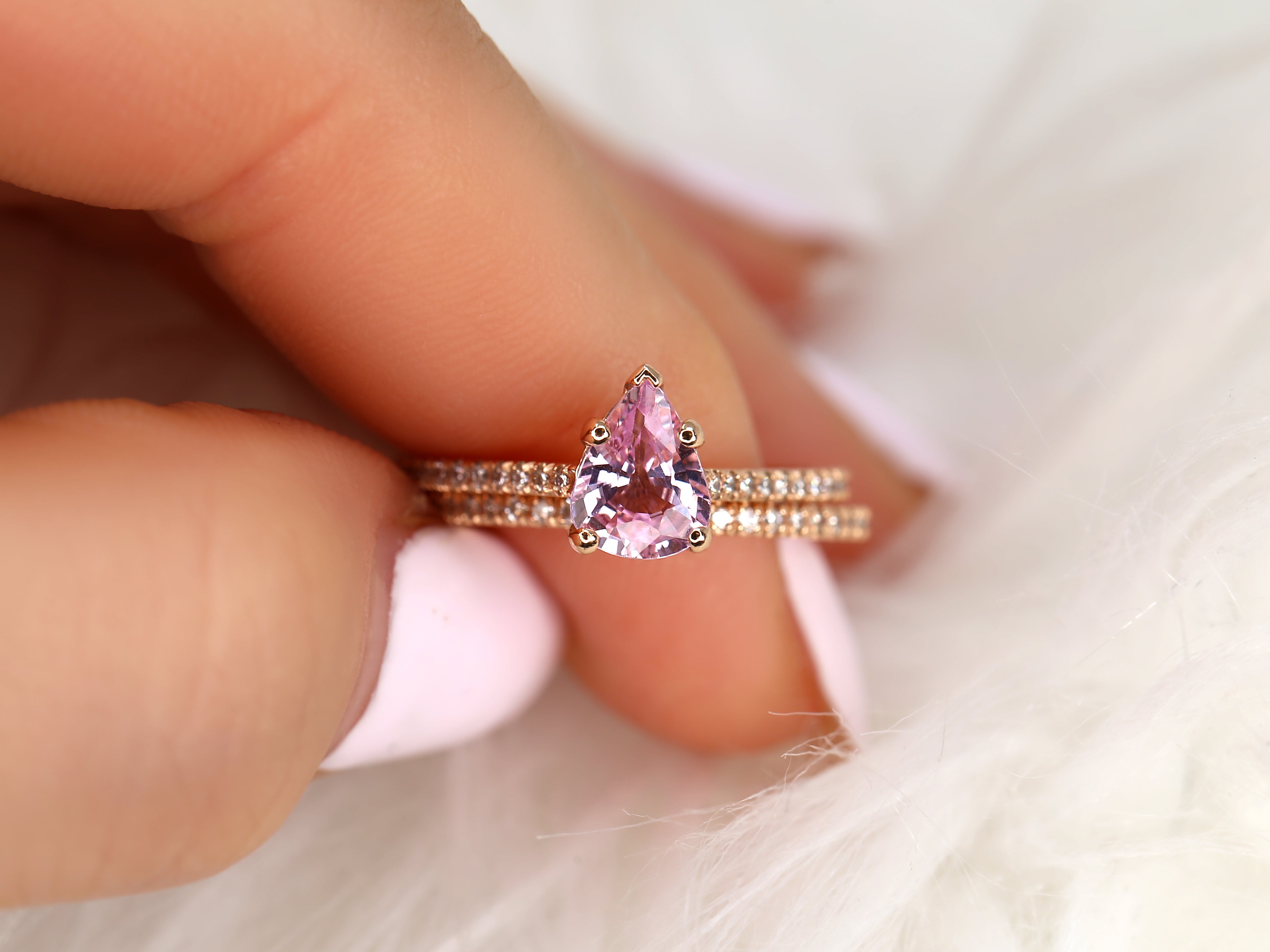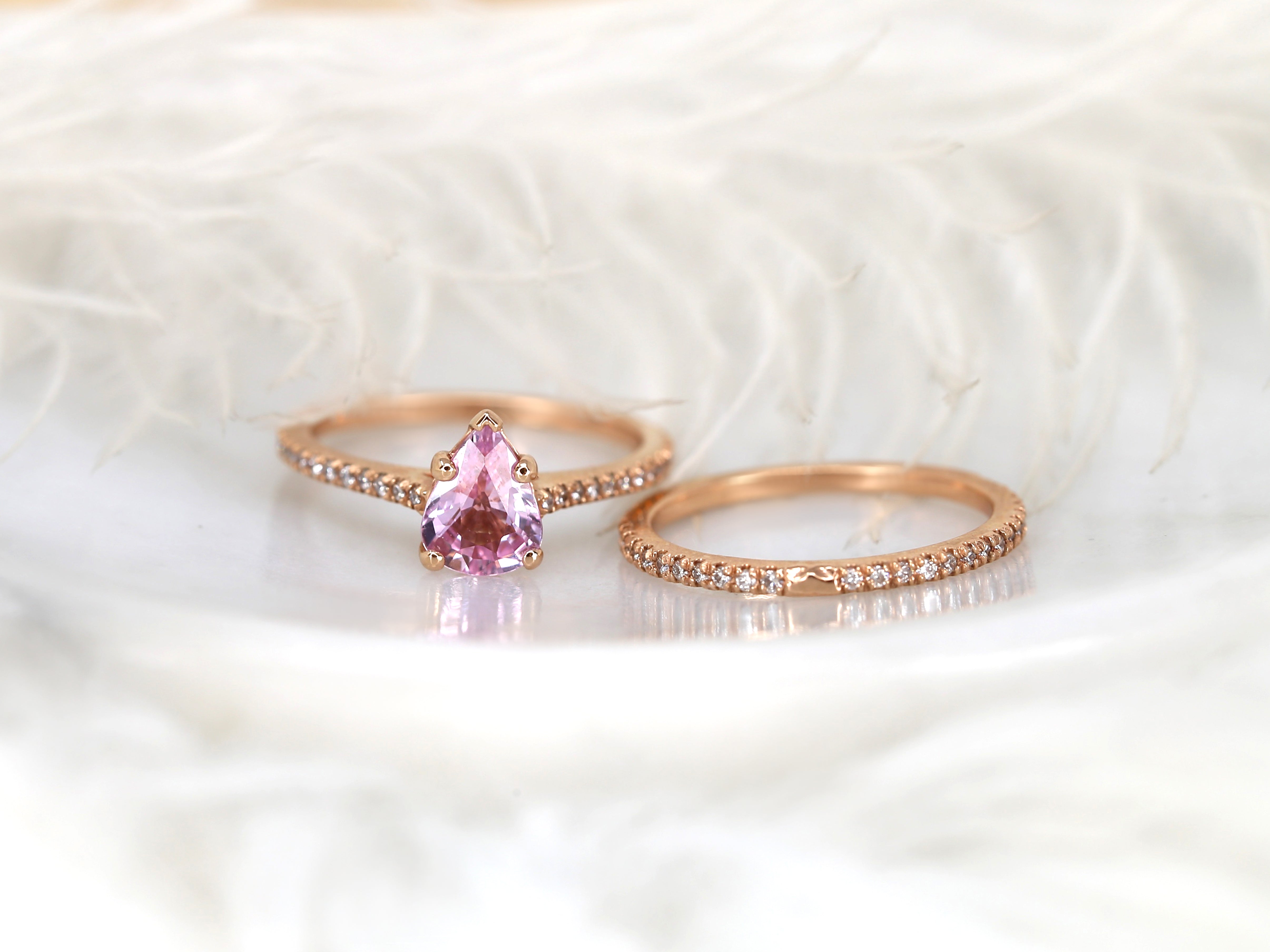 1.09ct Ann 14kt Rose Gold Pear Peach Blush Sapphire and Diamonds Cathedral Classic Bridal Set