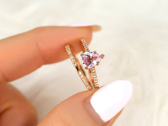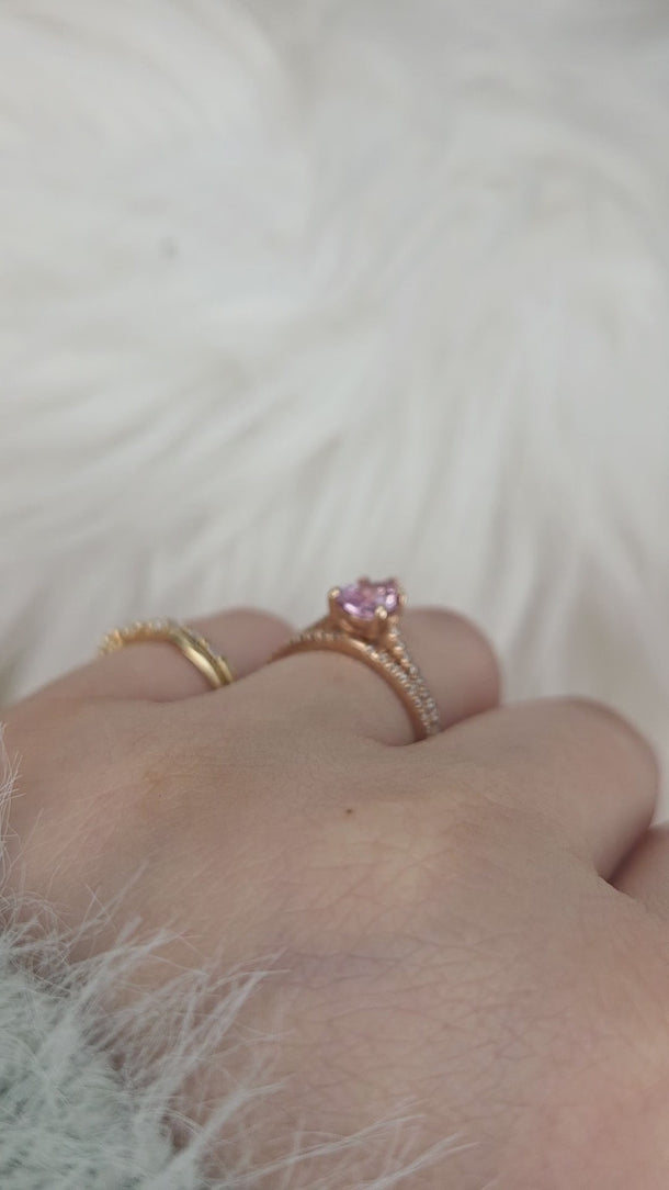 Softly glowing with warmth and grace, the Ann bridal set features a 1.09ct pear-cut sapphire in a romantic blush hue with gentle notes of peach and champagne. Nestled in a dainty pavé diamond cathedral solitaire, the center stone sparkles with timeless elegance. Paired with a flush-fitting diamond band, this 14kt rose gold set is handcrafted using recycled gold and conflict-free stones—a delicate blend of classic beauty and modern softness, made for a love that’s graceful and deeply felt.