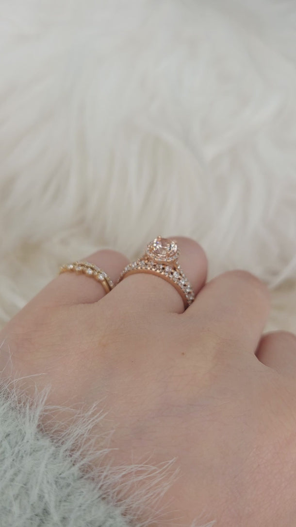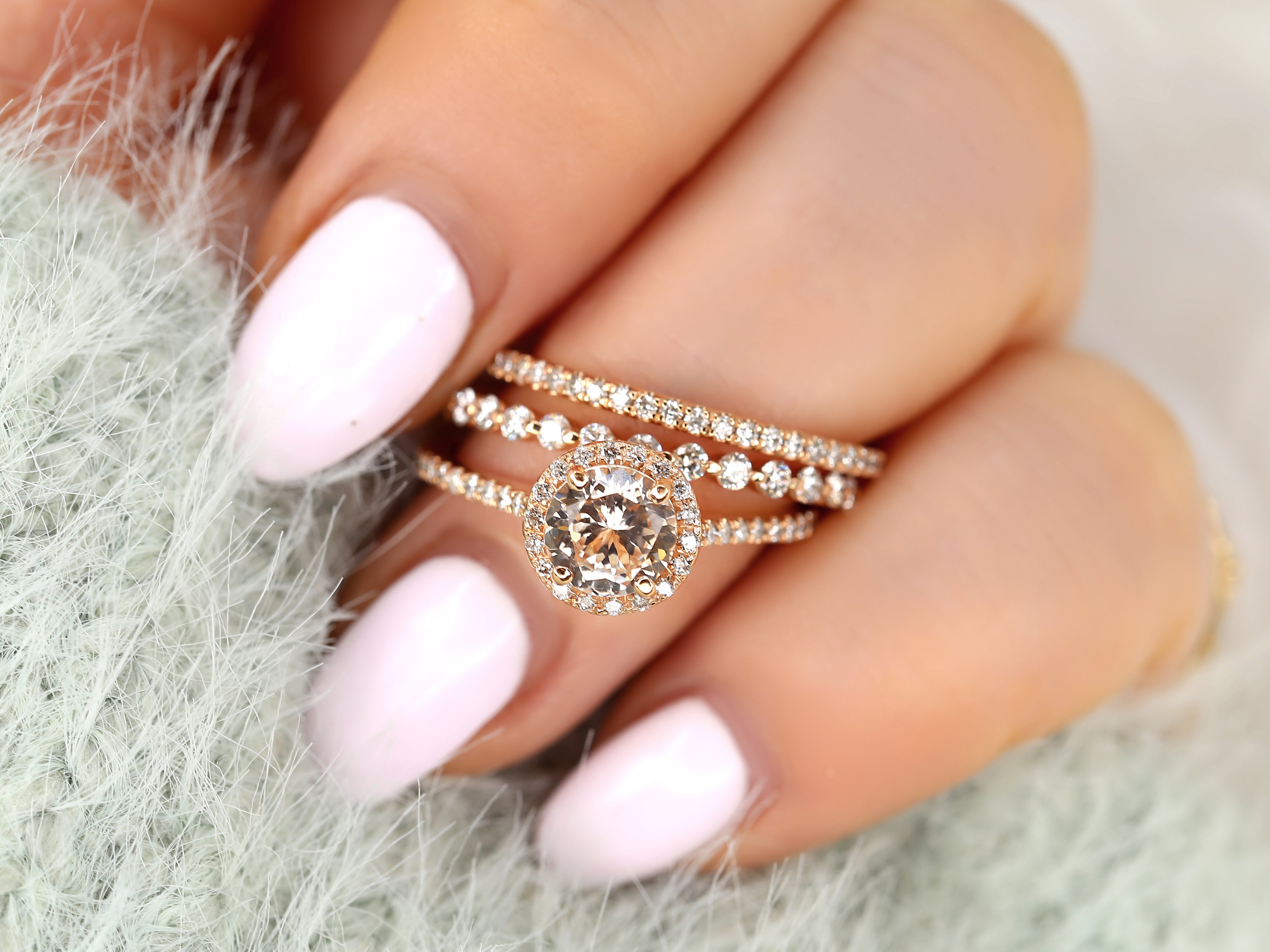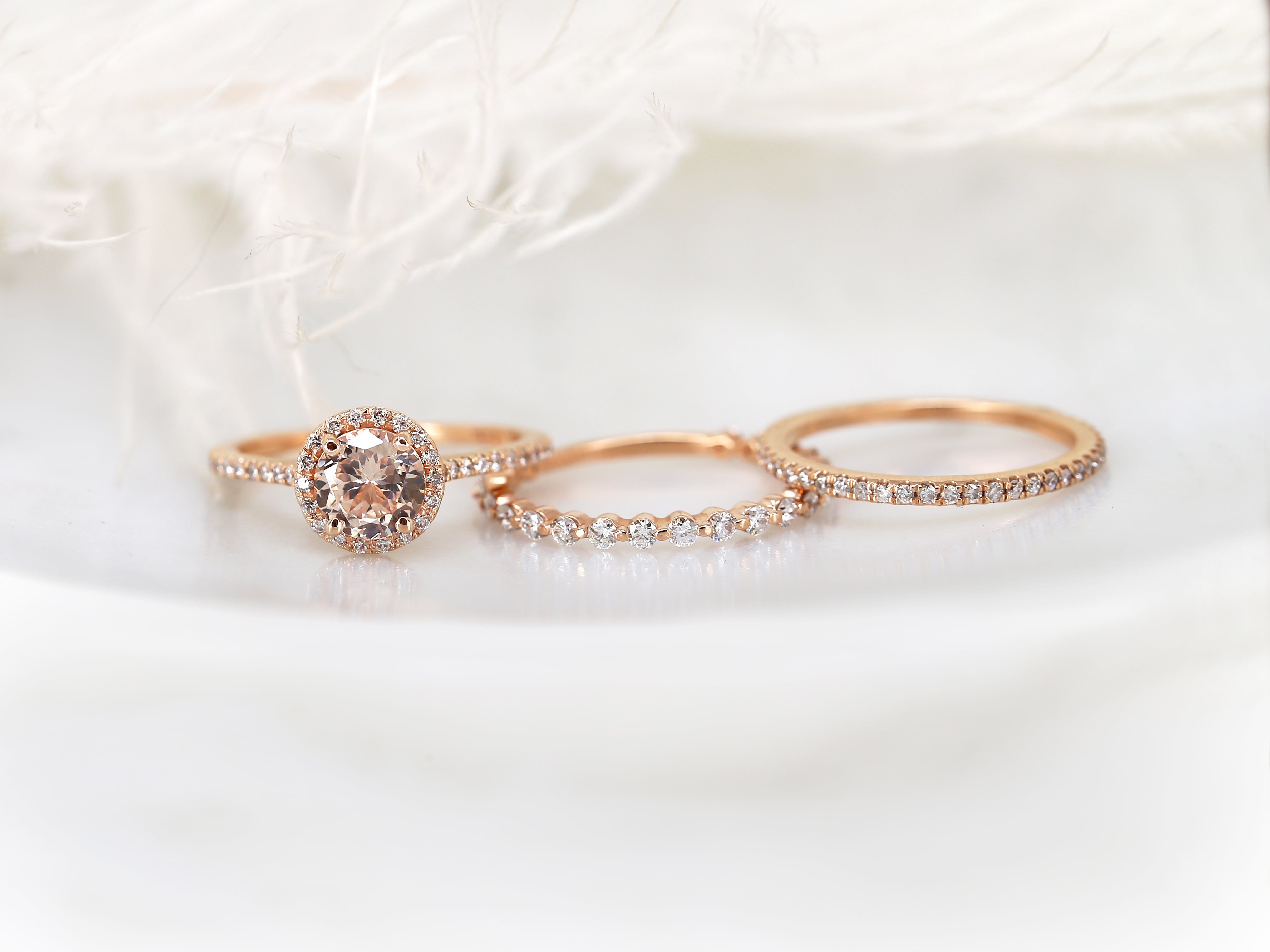Bold elegance with a soft glow—the Kubian bridal set features a 1.33ct round Light Icy Butter Champagne sapphire, kissed with dreamy notes of peachy blush. Nestled in a dainty diamond halo and set in 14kt rose gold, the engagement ring shines with a cathedral-style shank adorned in delicate diamonds. Paired with the Petite Naomi single prong diamond band and a matching diamond ring, this handcrafted trio stacks beautifully for a luminous, luxurious look—ethically made with recycled gold and conflict-free stones for love that sparkles with meaning.