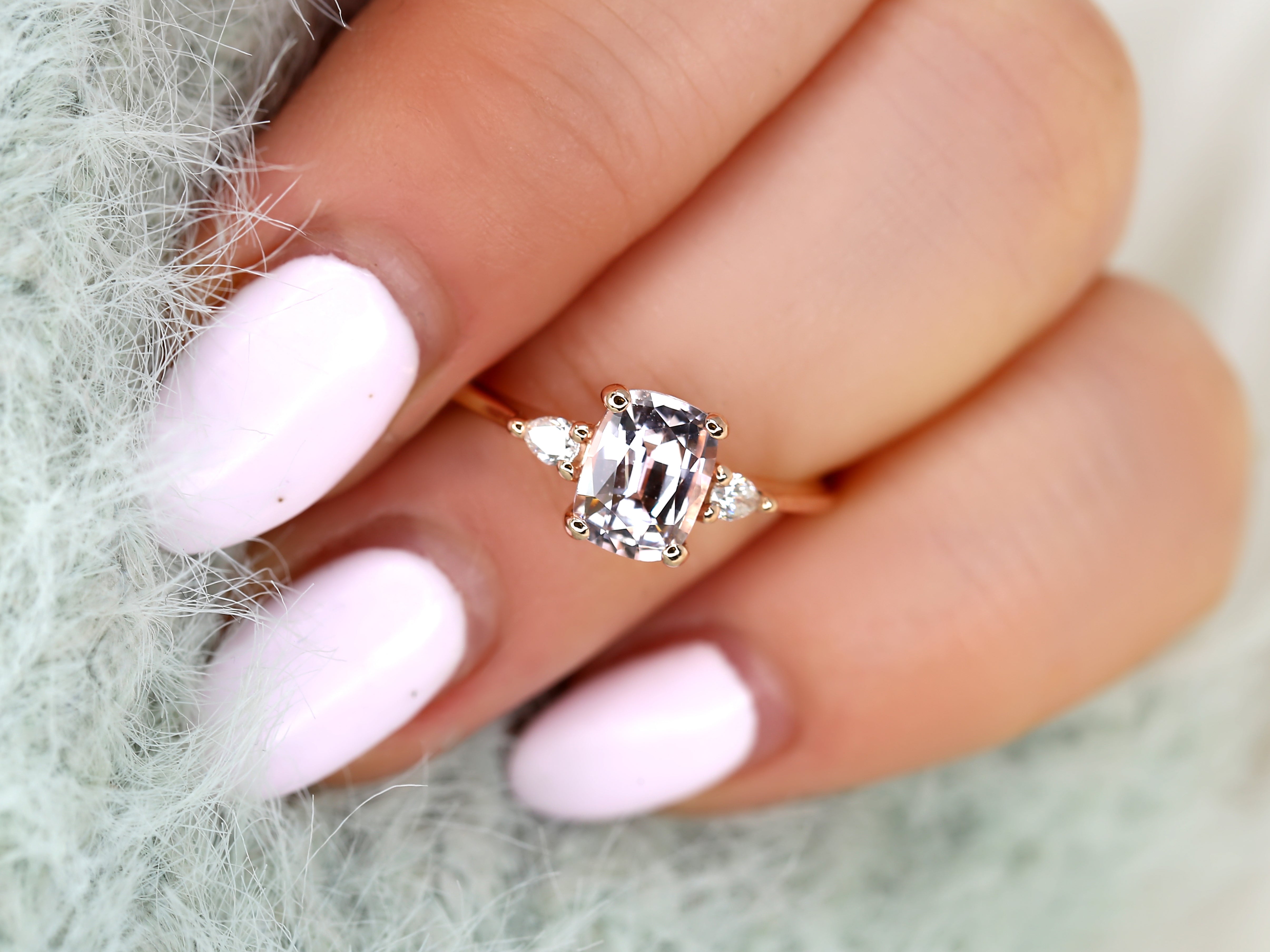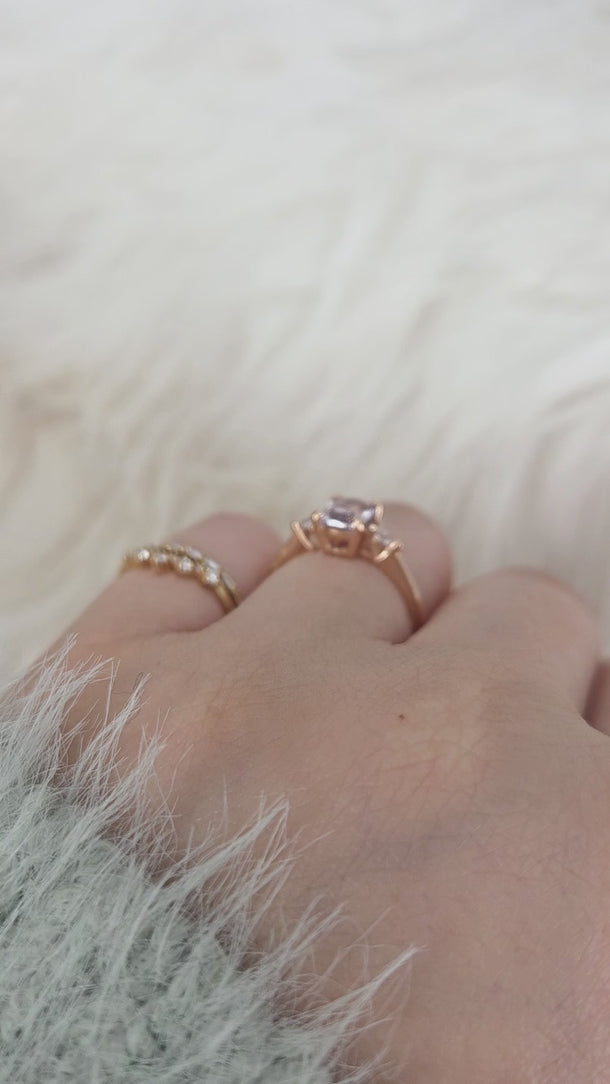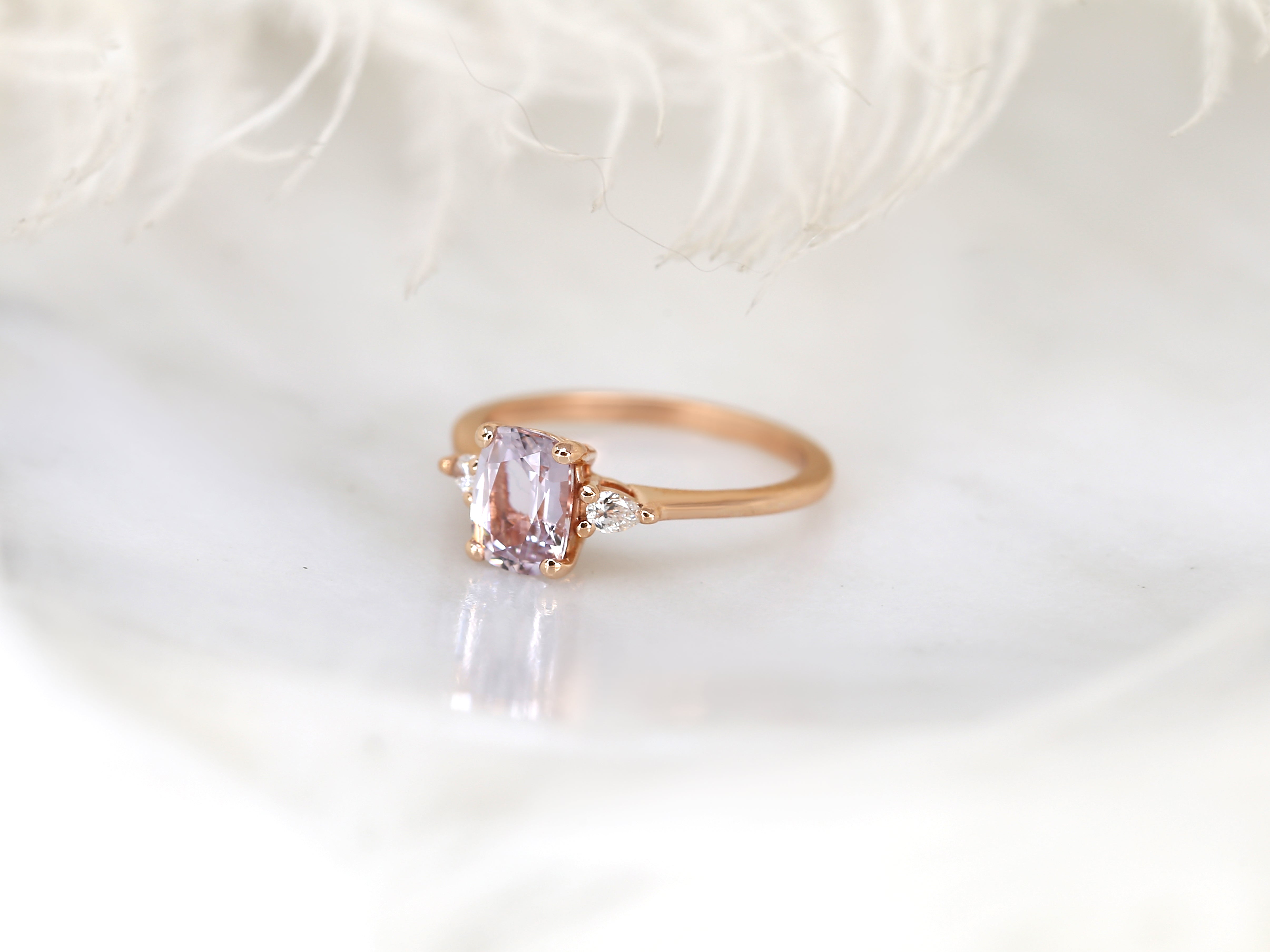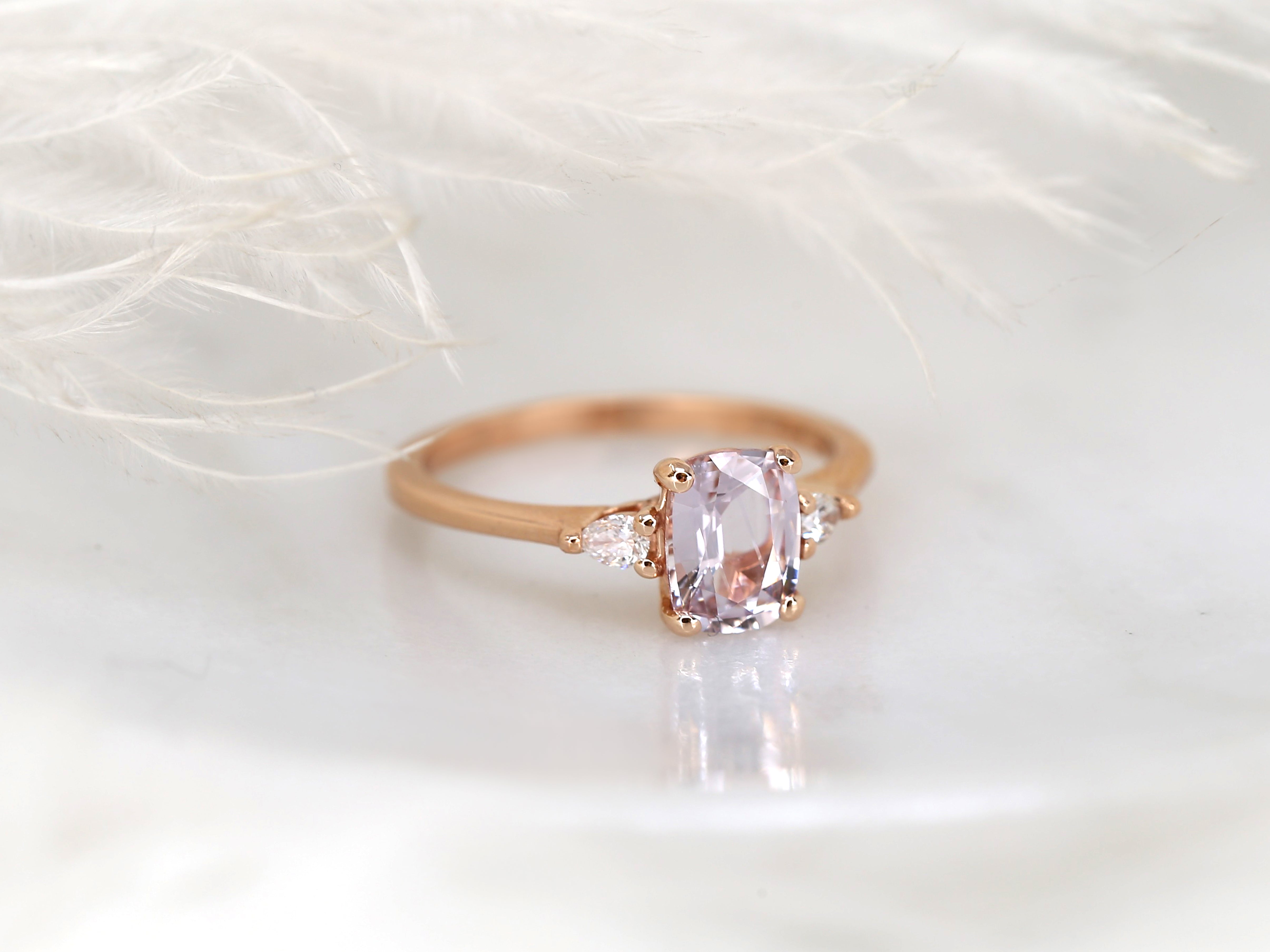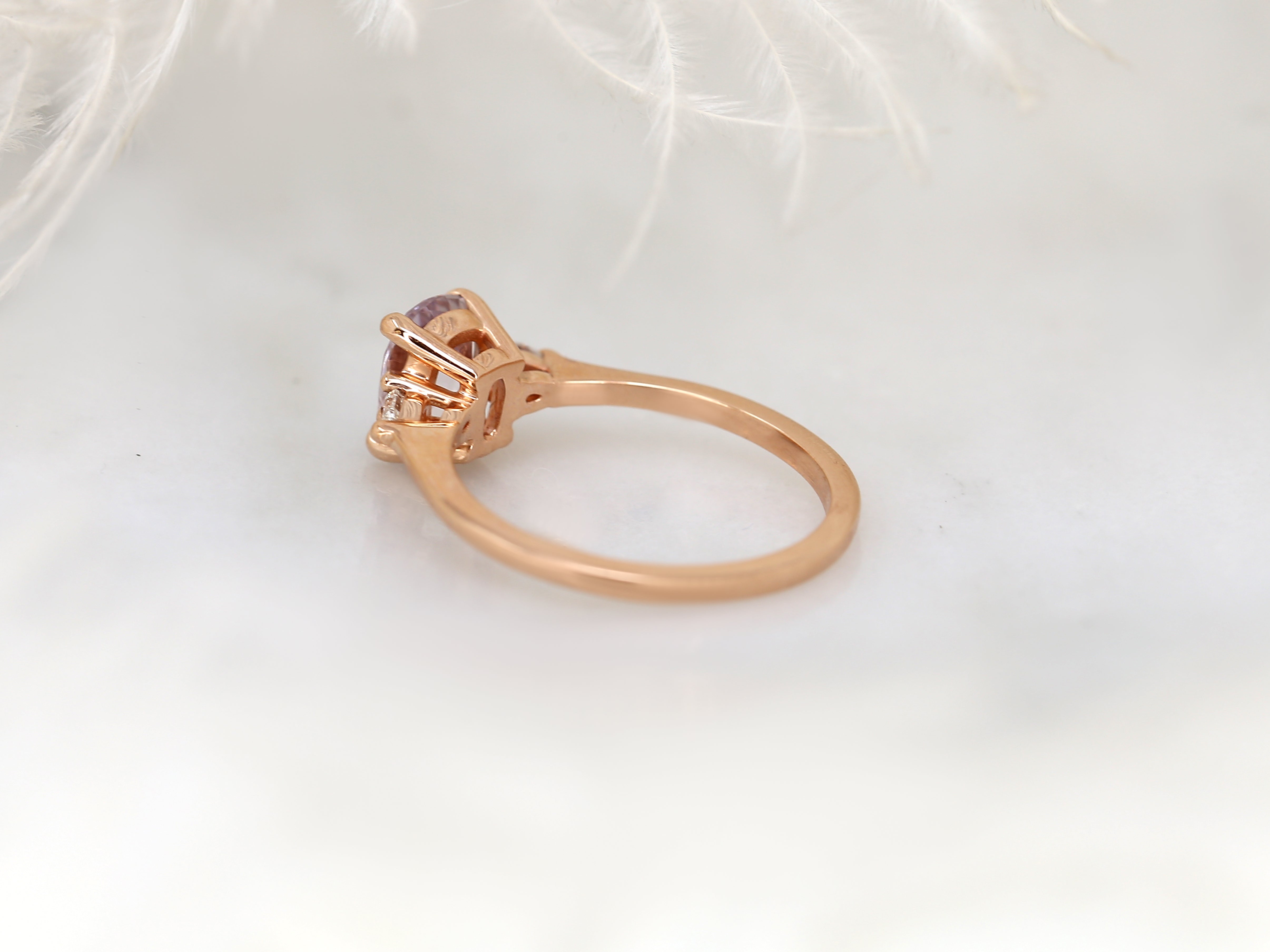 1.40ct Petite Ellis 14kt Rose Gold Blush Peach Sapphire Diamond Three Stone Oval Ring