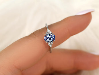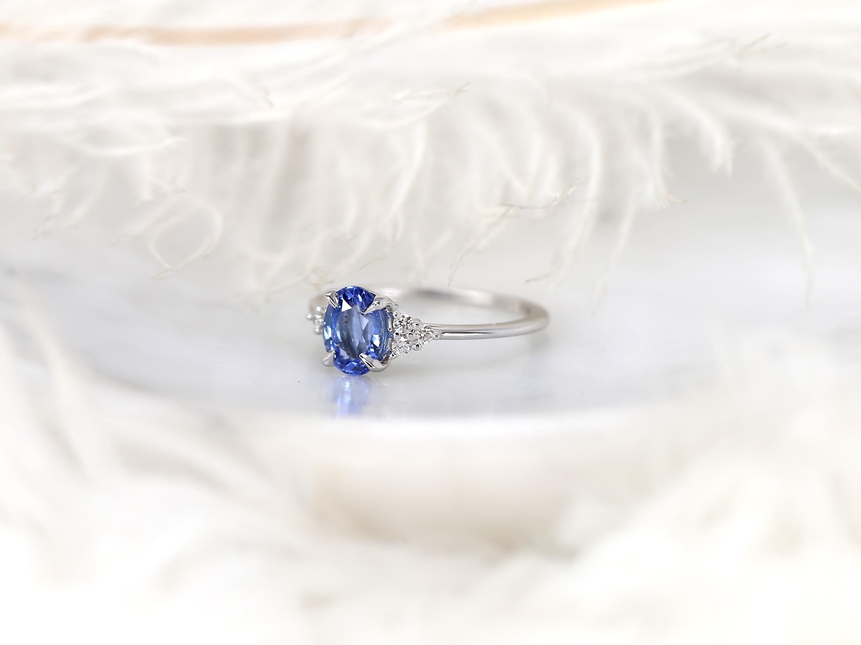 The Juniper ring blooms with delicate color and timeless charm. A 1.46ct one-of-a-kind oval cornflower sapphire with soft lavender undertones rests at the center, framed by diamond clusters that glimmer like tiny berries. Nature-inspired and romantic, this design evokes effortless elegance and organic beauty. Handcrafted in 14kt white gold within our Chicago studio, the ring is ready to ship after sizing—perfect for an anniversary, gift, or cherished keepsake.