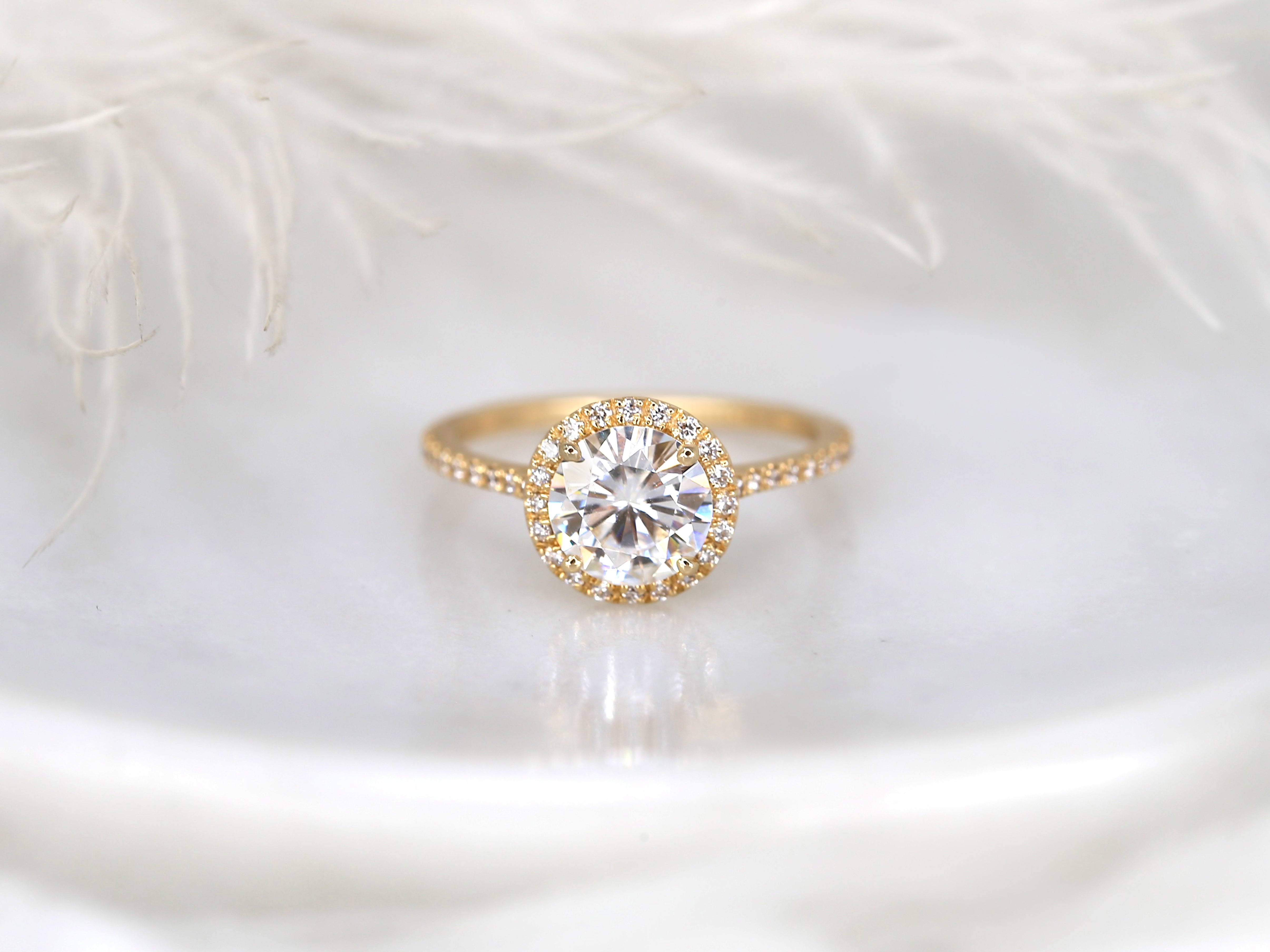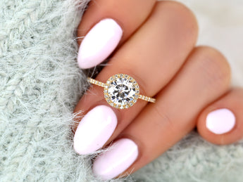 The Kimberly ring captures elegant sparkle in a modern, romantic silhouette. A 7.5mm round moissanite glows within a delicate diamond halo, set atop an almost-eternity diamond shank that shimmers with every movement. Made to order in your choice of 14kt gold color, this timeless halo design is crafted with care and created to celebrate your forever story.