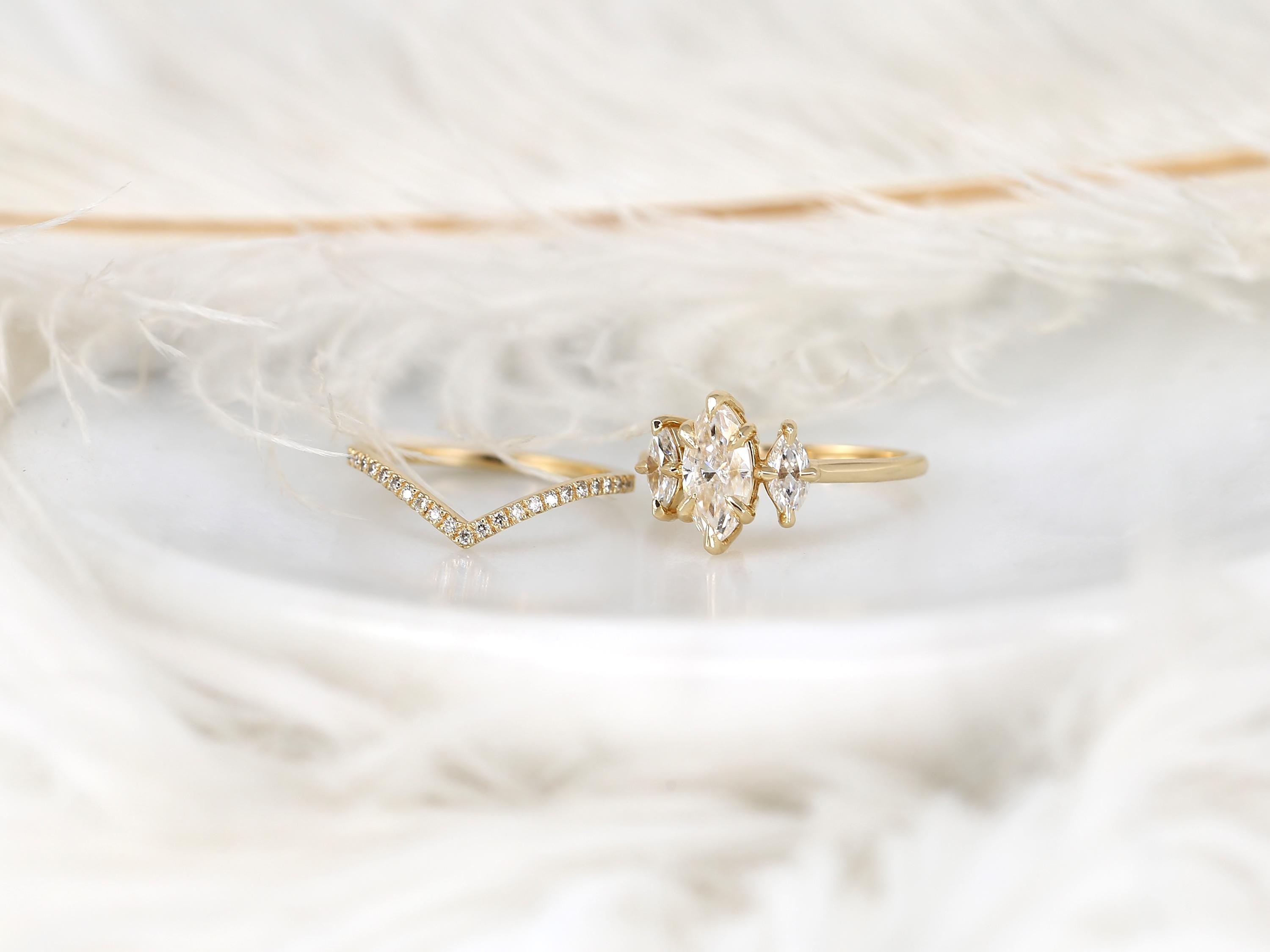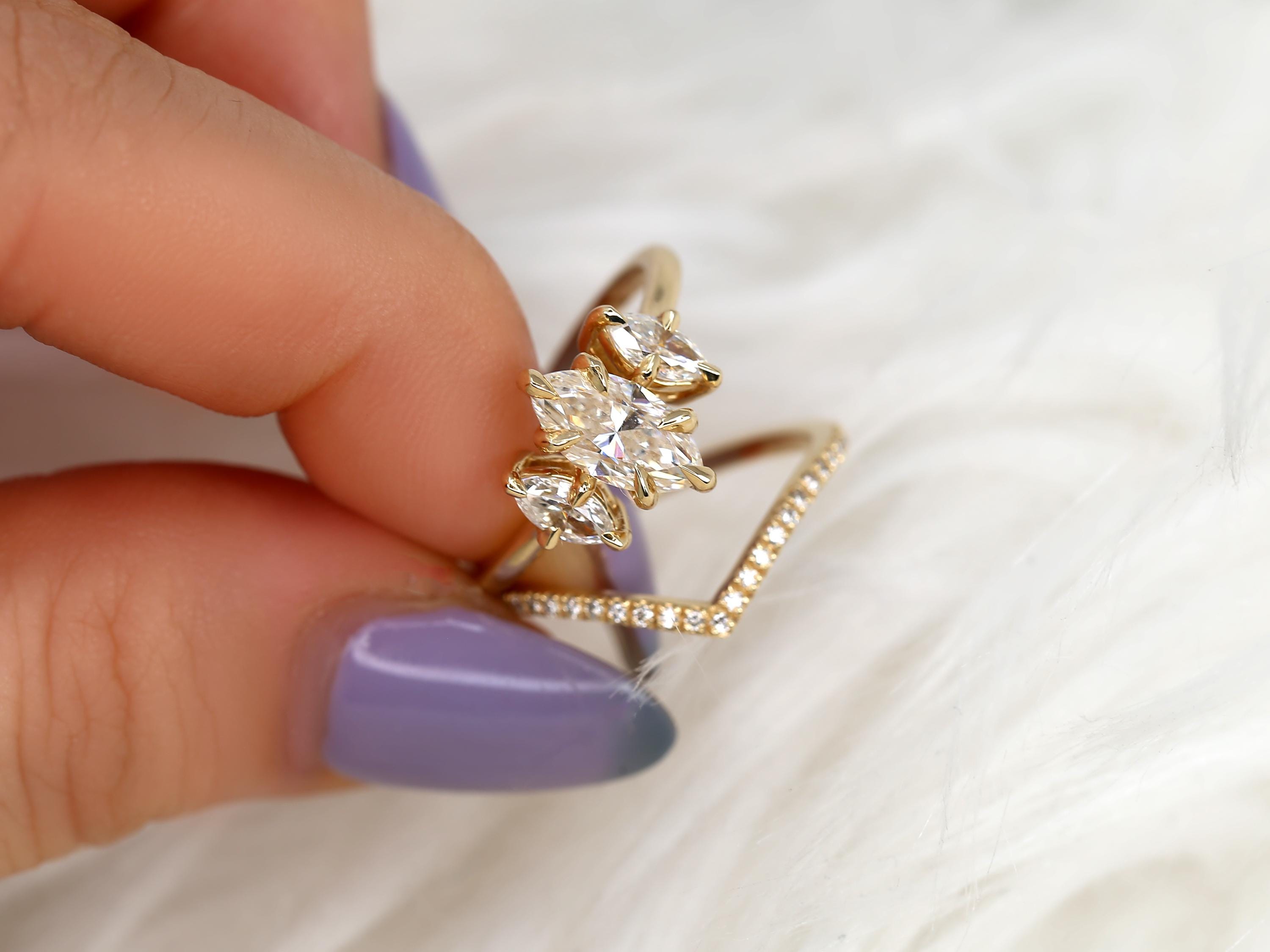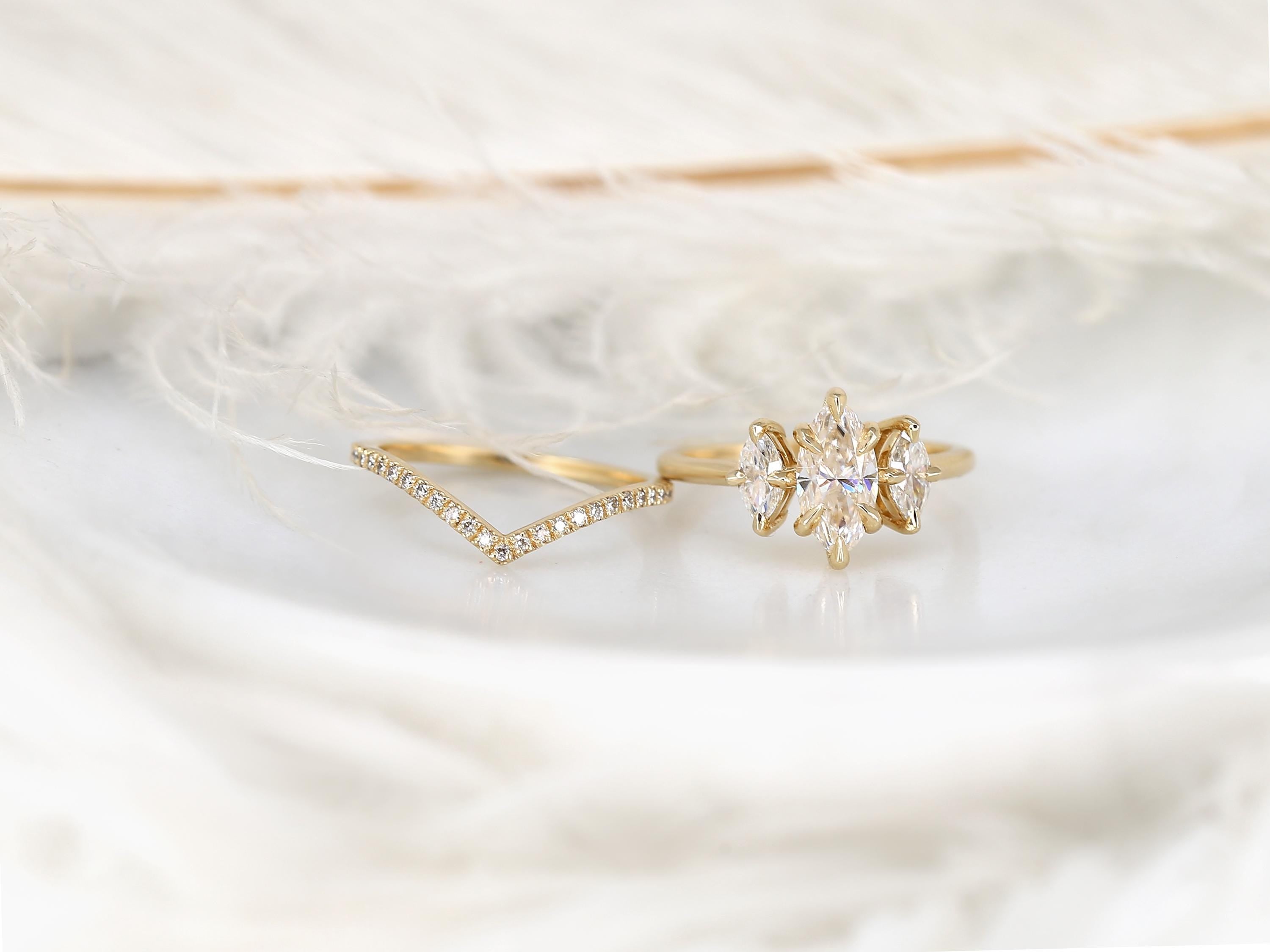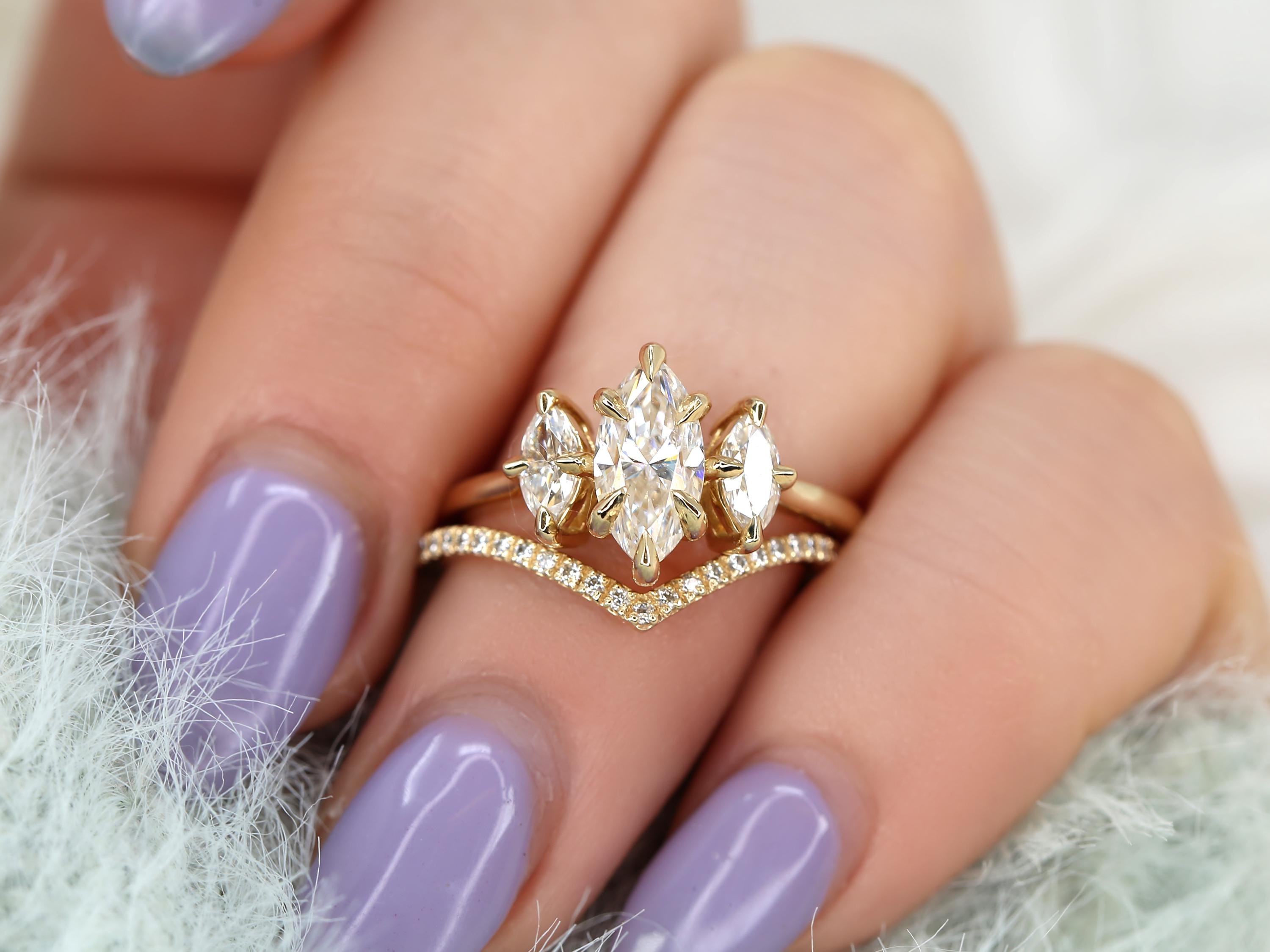 The Beckett & Chevy bridal set showcases a 10x5mm marquise moissanite in a classic three-stone trilogy layout that elongates the finger with graceful symmetry. The Chevy band features a sculpted chevron design accented with diamonds, designed to nest beautifully against the marquise center. Crafted in 14kt gold, this marquise engagement ring set blends modern lines with timeless sparkle for a bold yet refined statement.