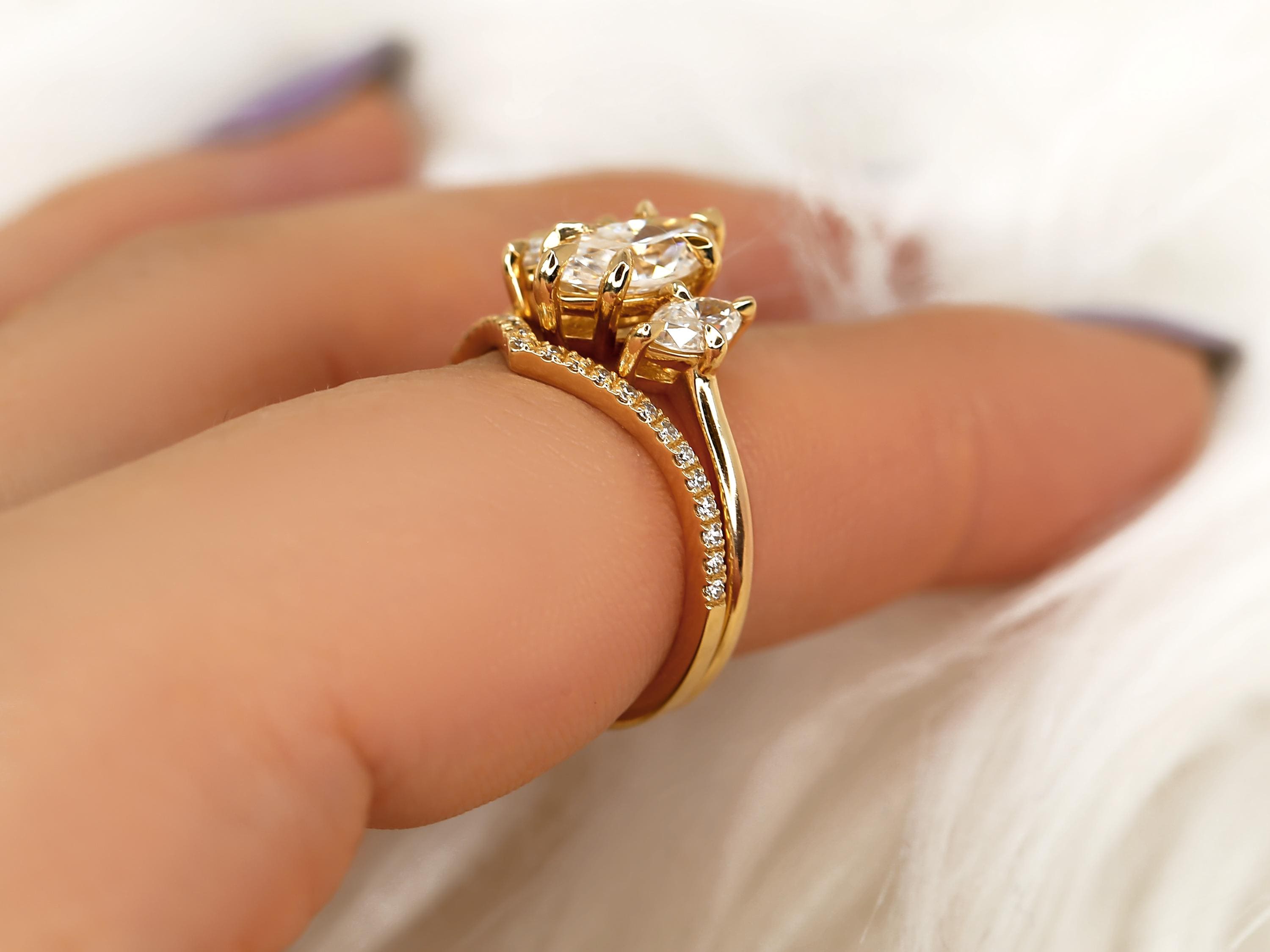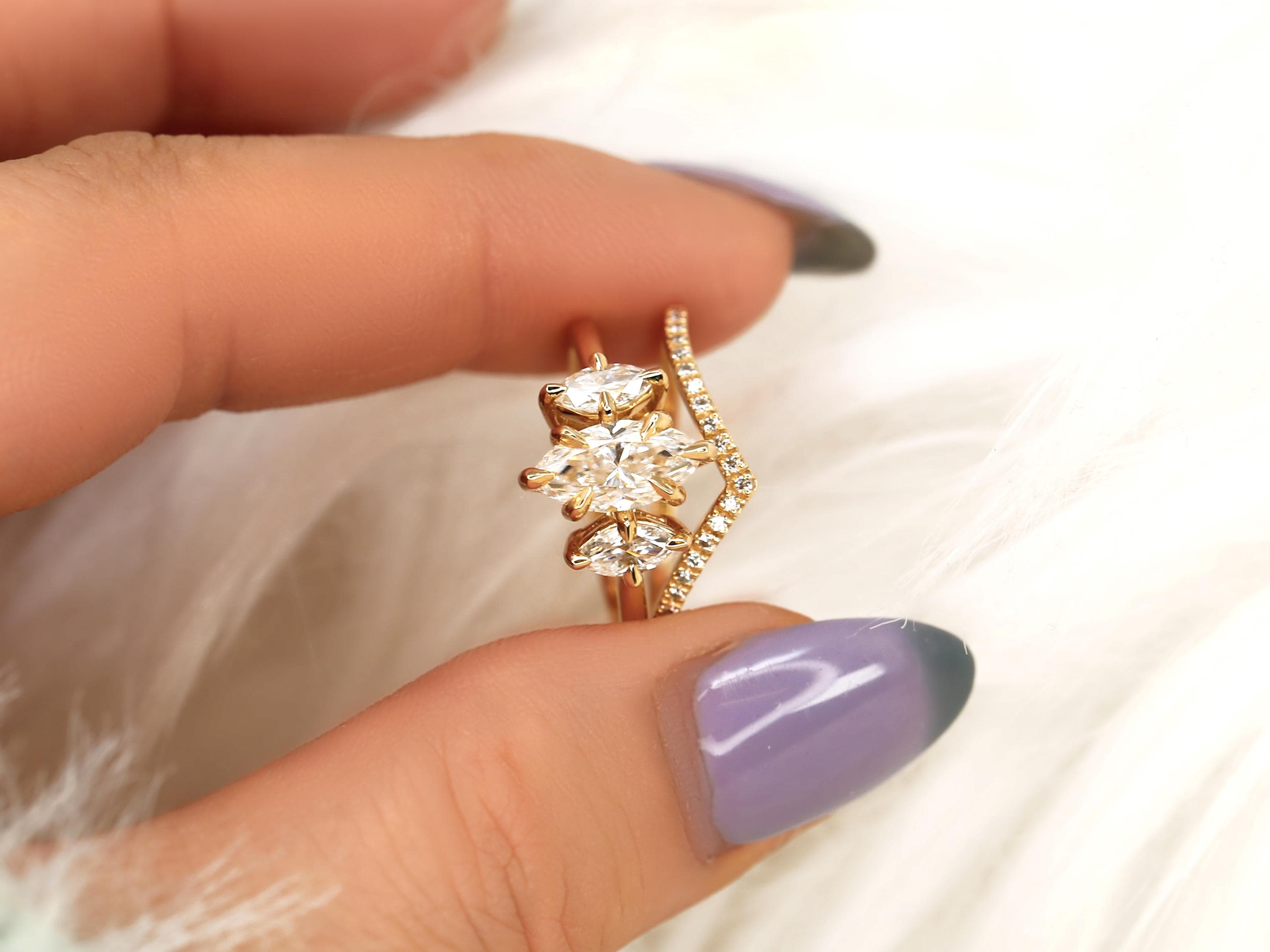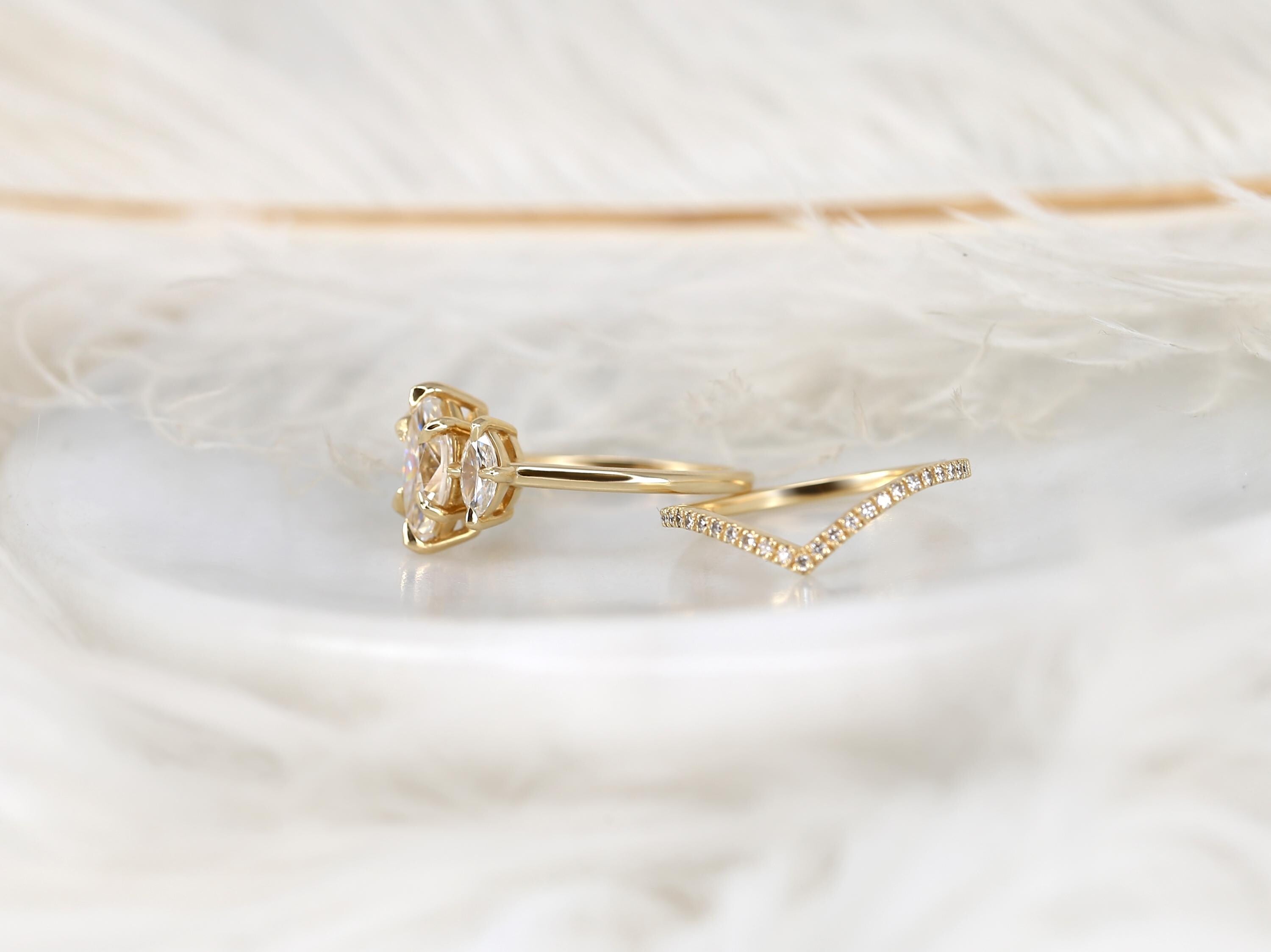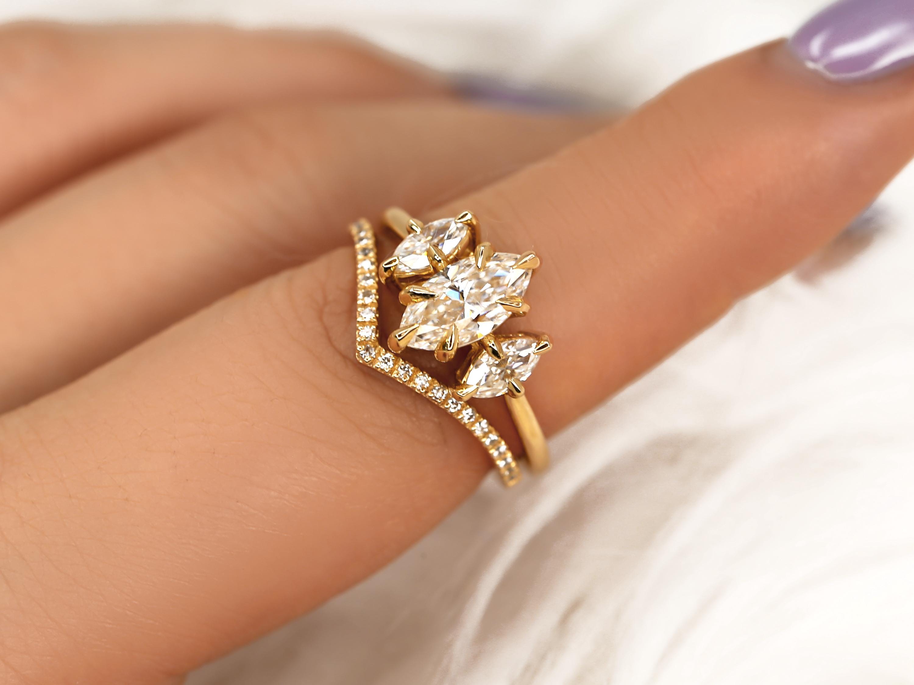 The Beckett & Chevy bridal set showcases a 10x5mm marquise moissanite in a classic three-stone trilogy layout that elongates the finger with graceful symmetry. The Chevy band features a sculpted chevron design accented with diamonds, designed to nest beautifully against the marquise center. Crafted in 14kt gold, this marquise engagement ring set blends modern lines with timeless sparkle for a bold yet refined statement.