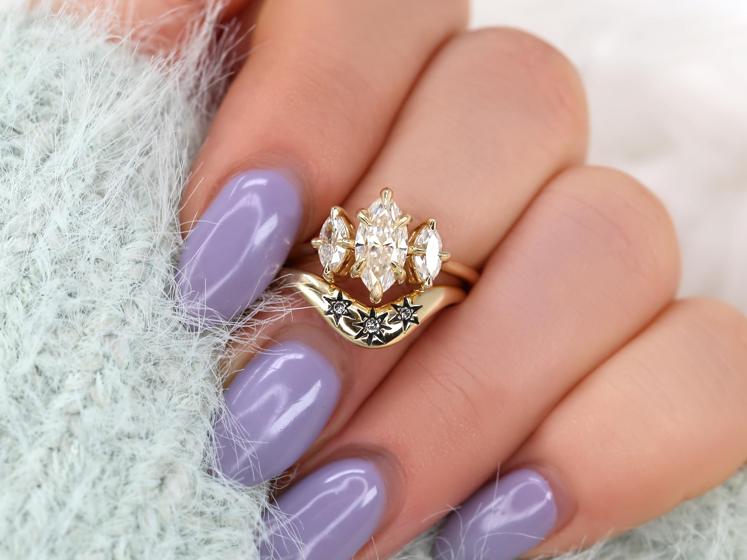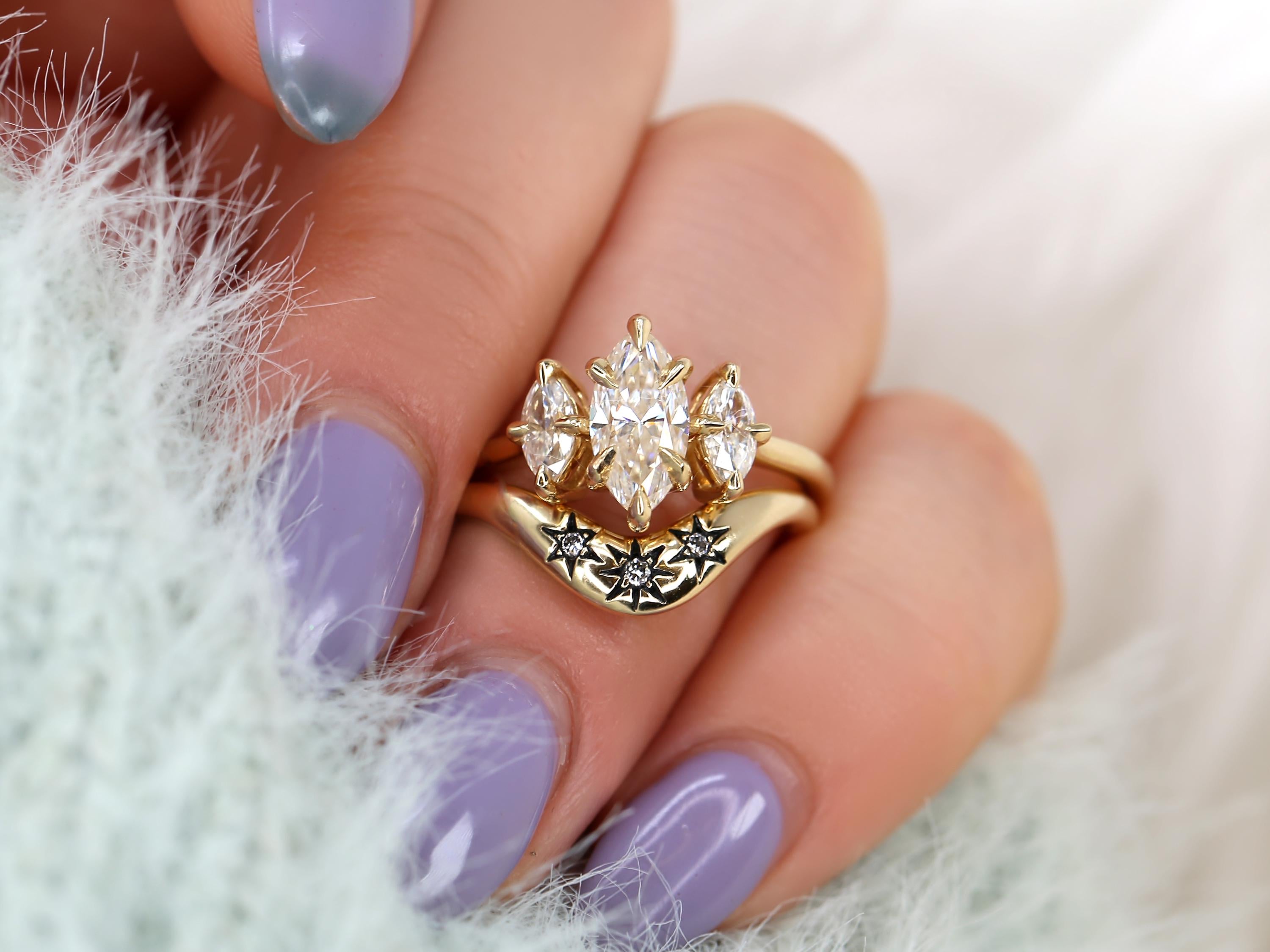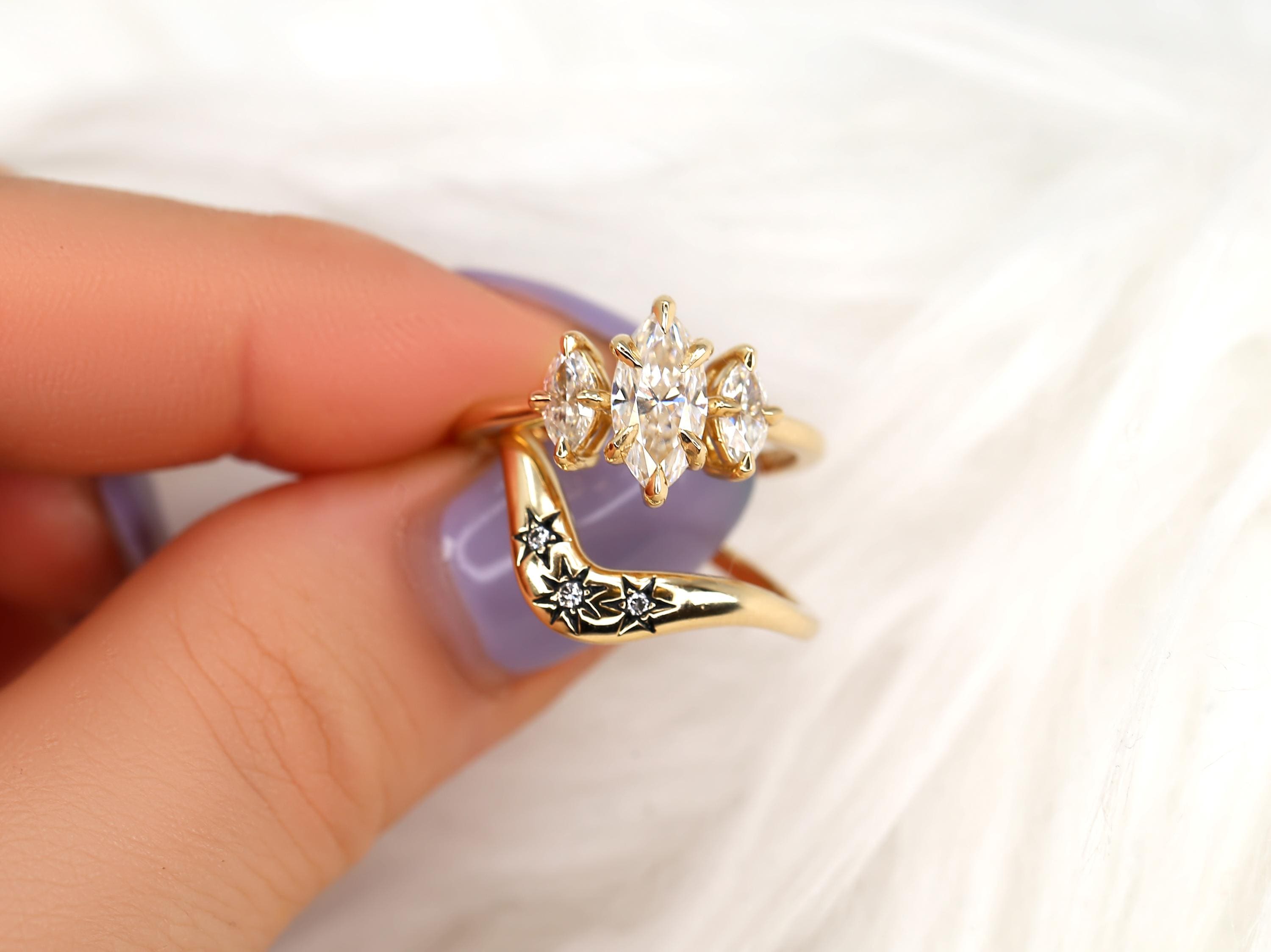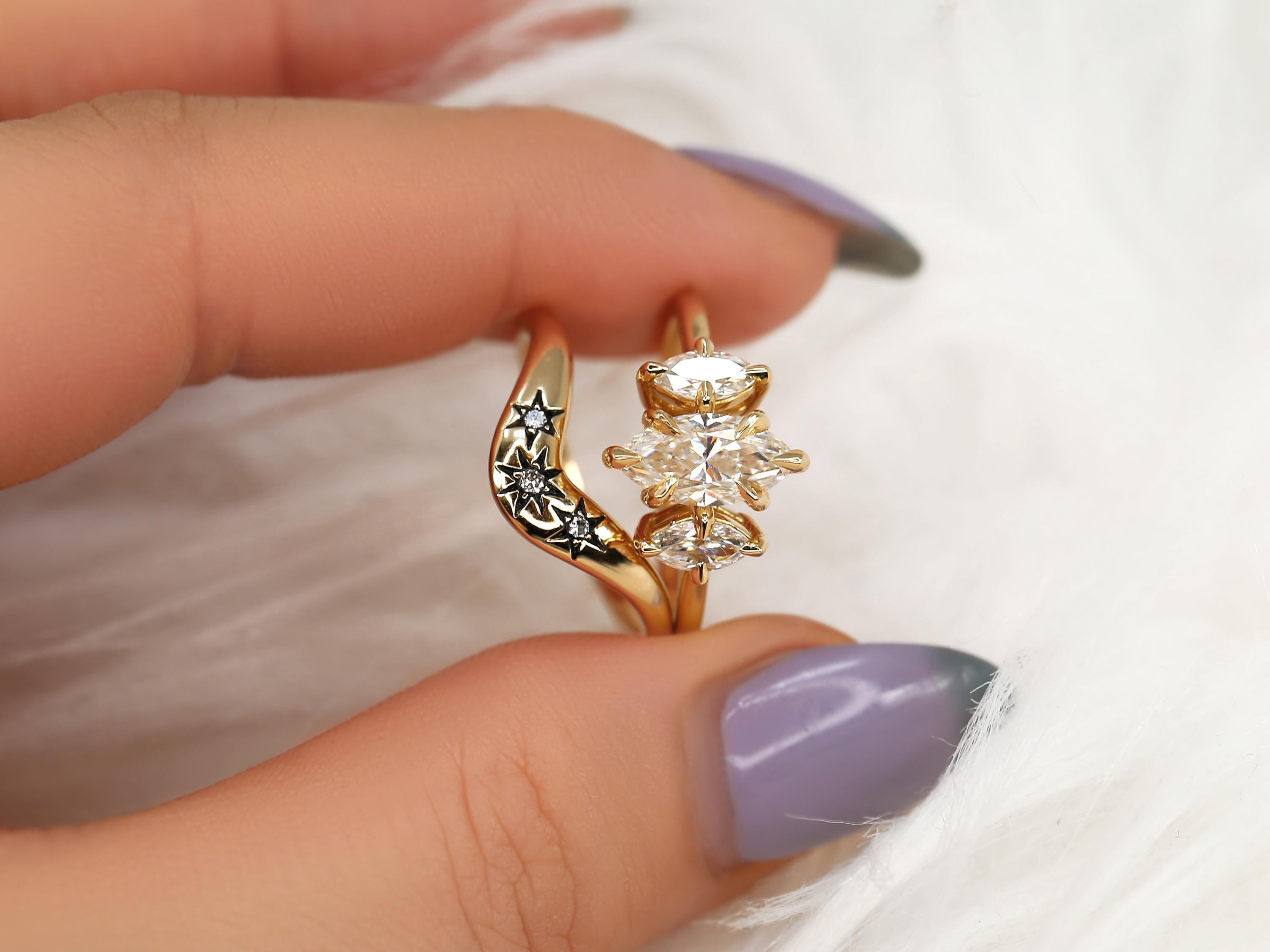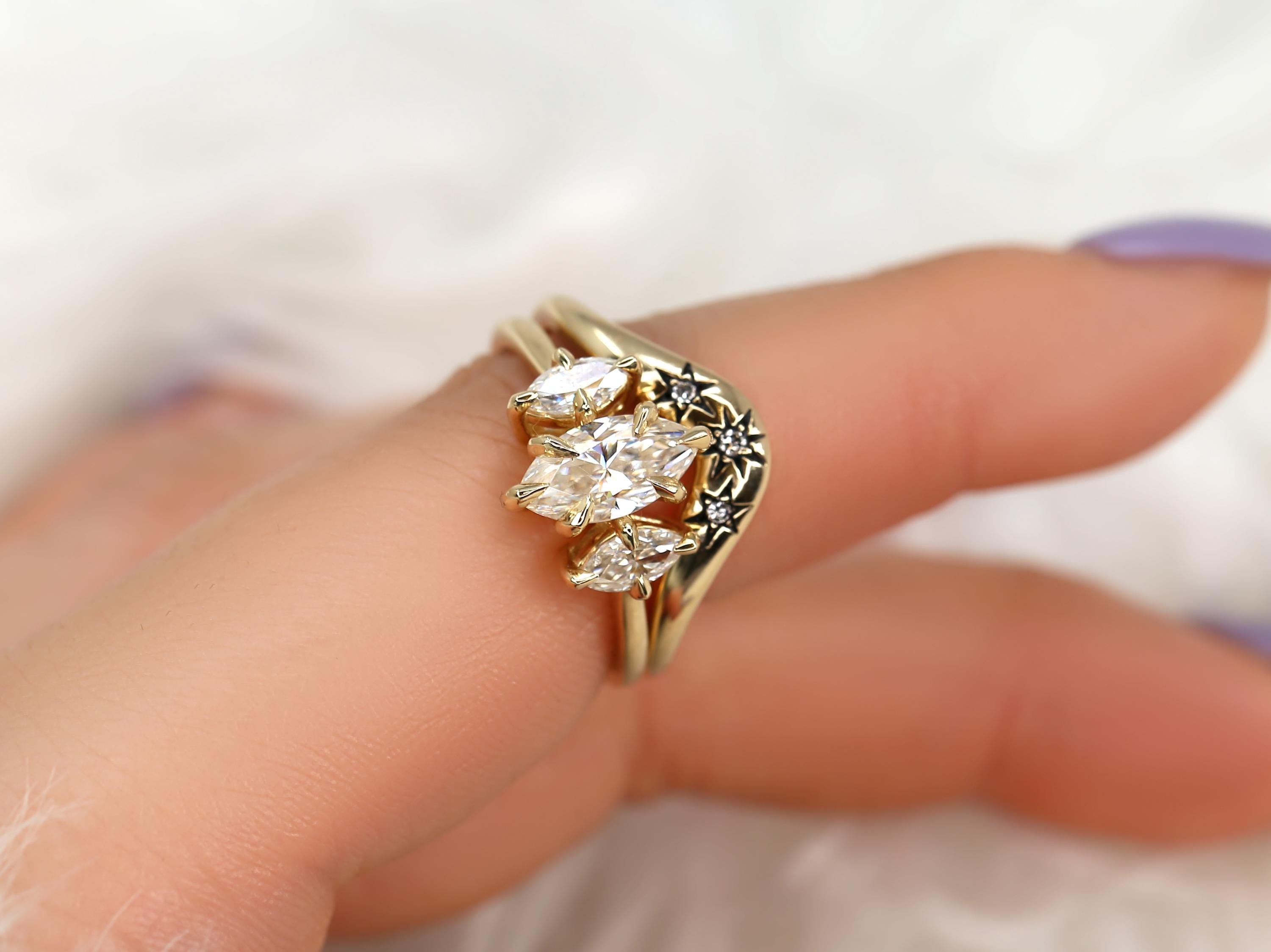The Beckett and Ursa bridal set blends celestial charm with modern sophistication. The Beckett engagement ring features three marquise-cut moissanites, each secured with talon prongs in a dainty cathedral setting—striking yet timeless. Paired with the Ursa band, adorned with three sparkling diamonds framed by celestial engravings and touches of black rhodium, this set evokes the beauty of the night sky. Handcrafted in 14kt gold in your choice of color, a bold and poetic union of light and mystery.