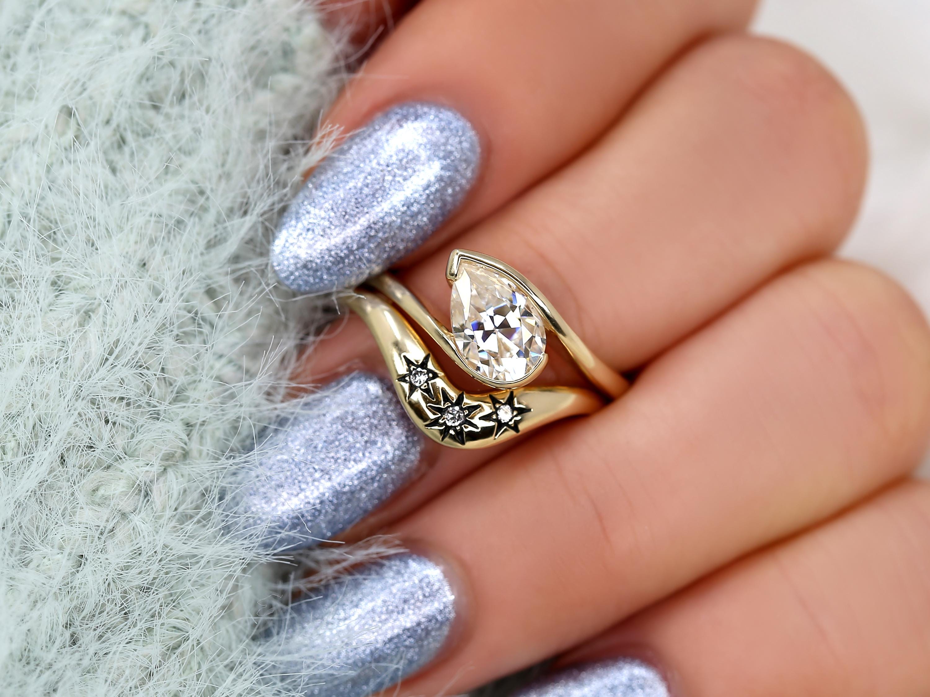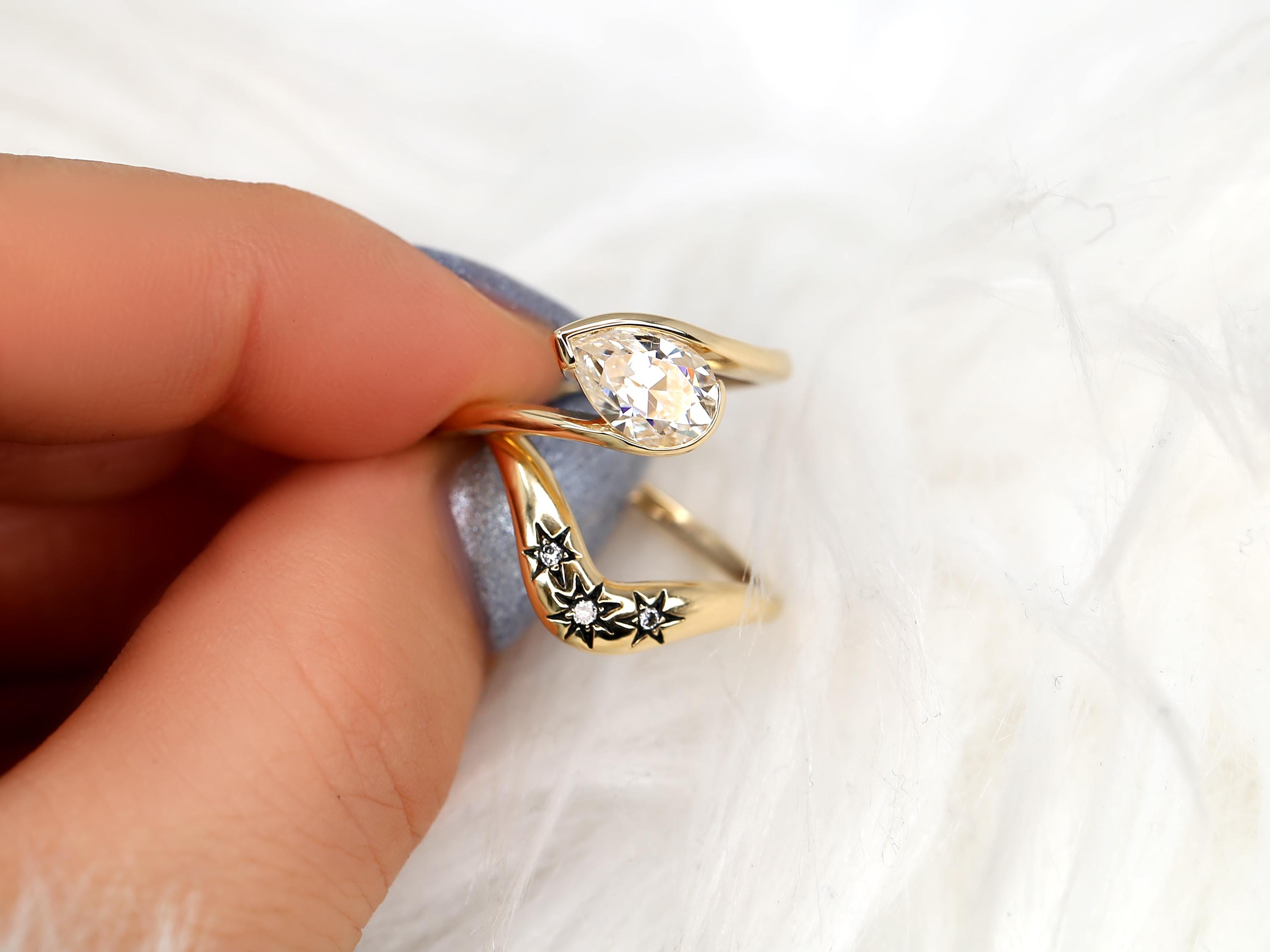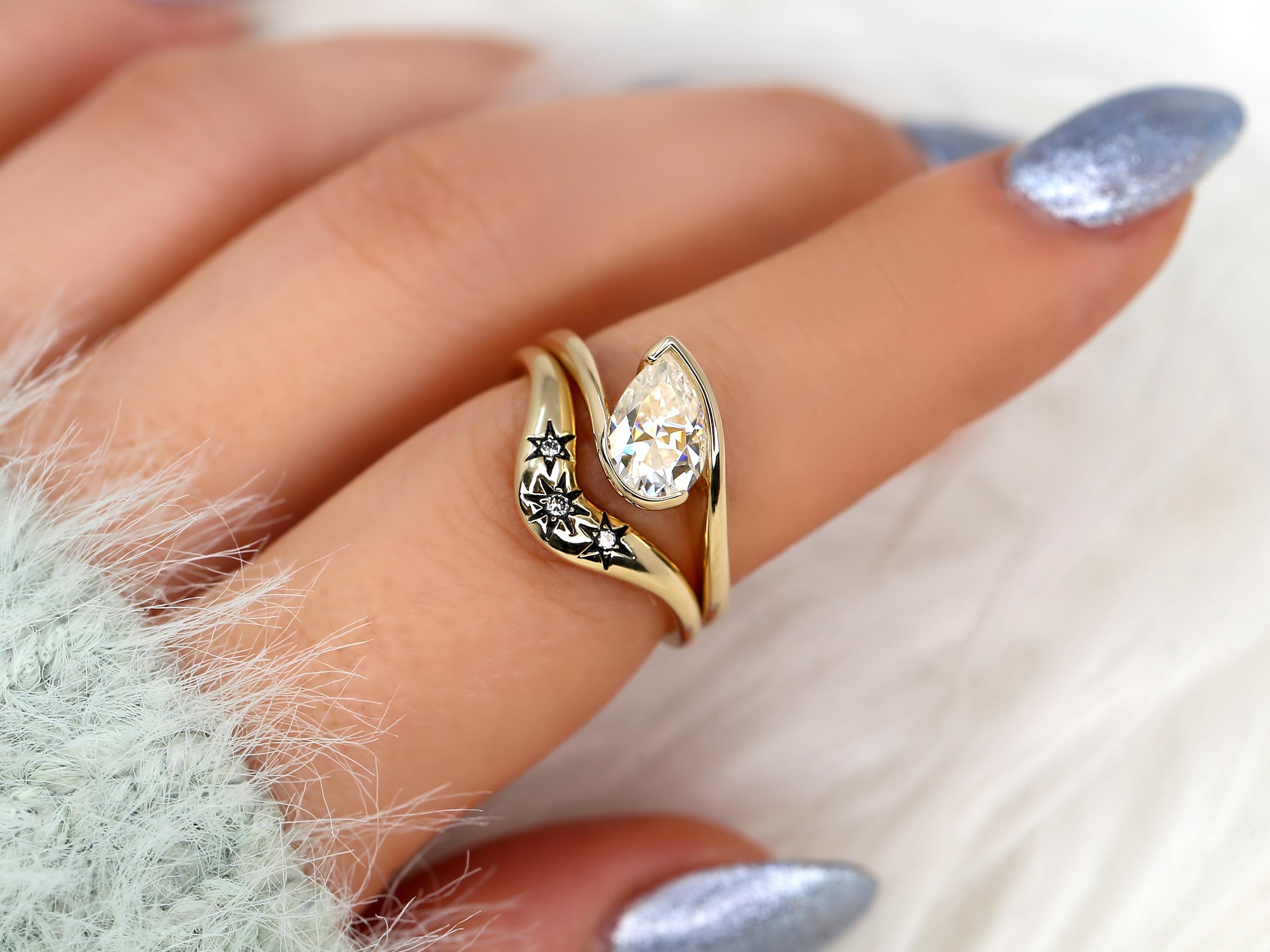 The Padme & Ursa engagement ring set centers a 9x6mm pear cut moissanite set on a graceful tilt, creating a modern slanted pear solitaire with quiet drama. Paired with the Ursa nesting band, designed with three star motifs symbolizing past, present, and future, the set evokes a celestial night sky. Black rhodium details add an edgy, vintage-inspired finish. Offered in any color 14kt gold for customization. Don’t see what you love? Share your vision and we can design from scratch.