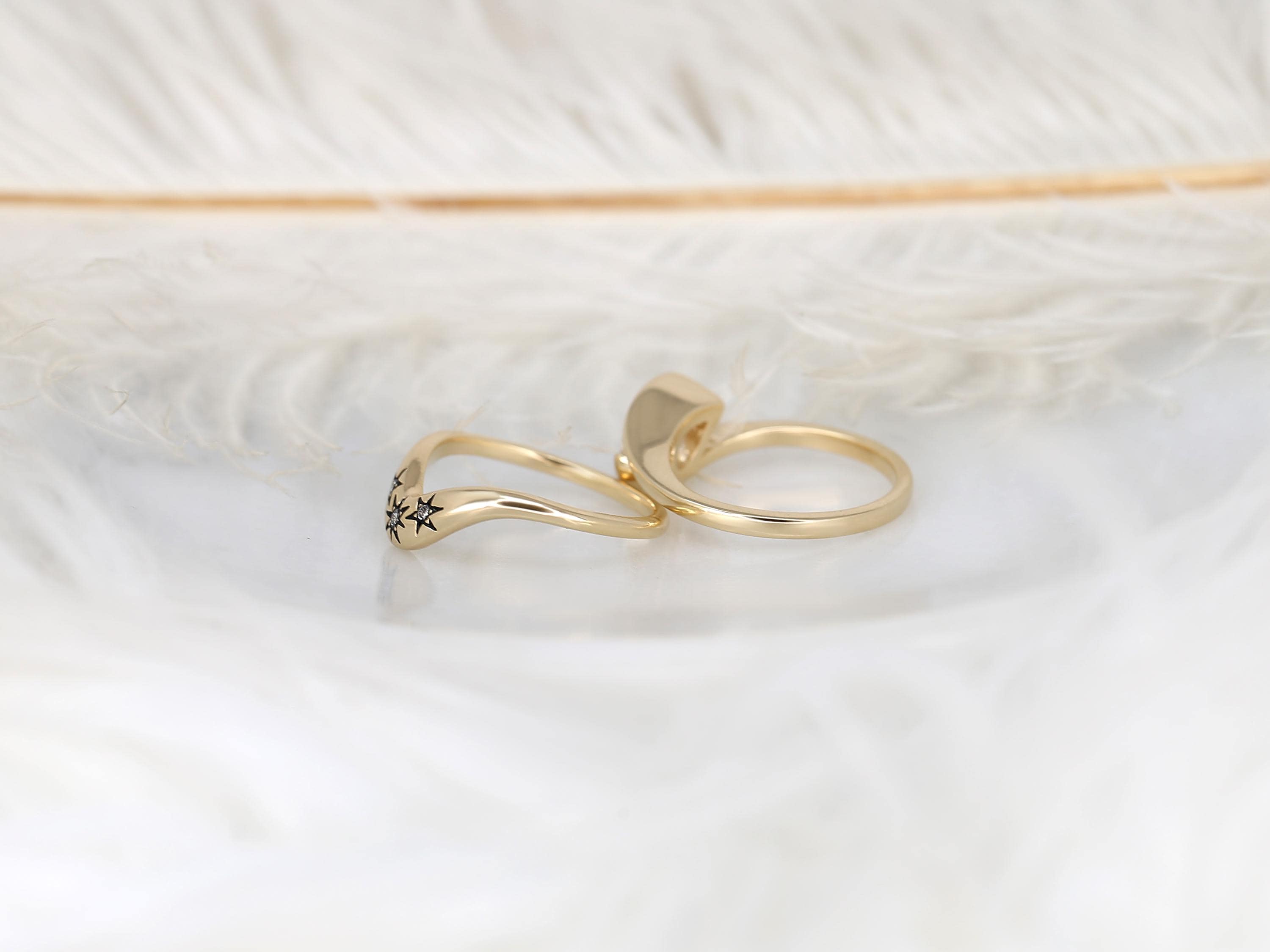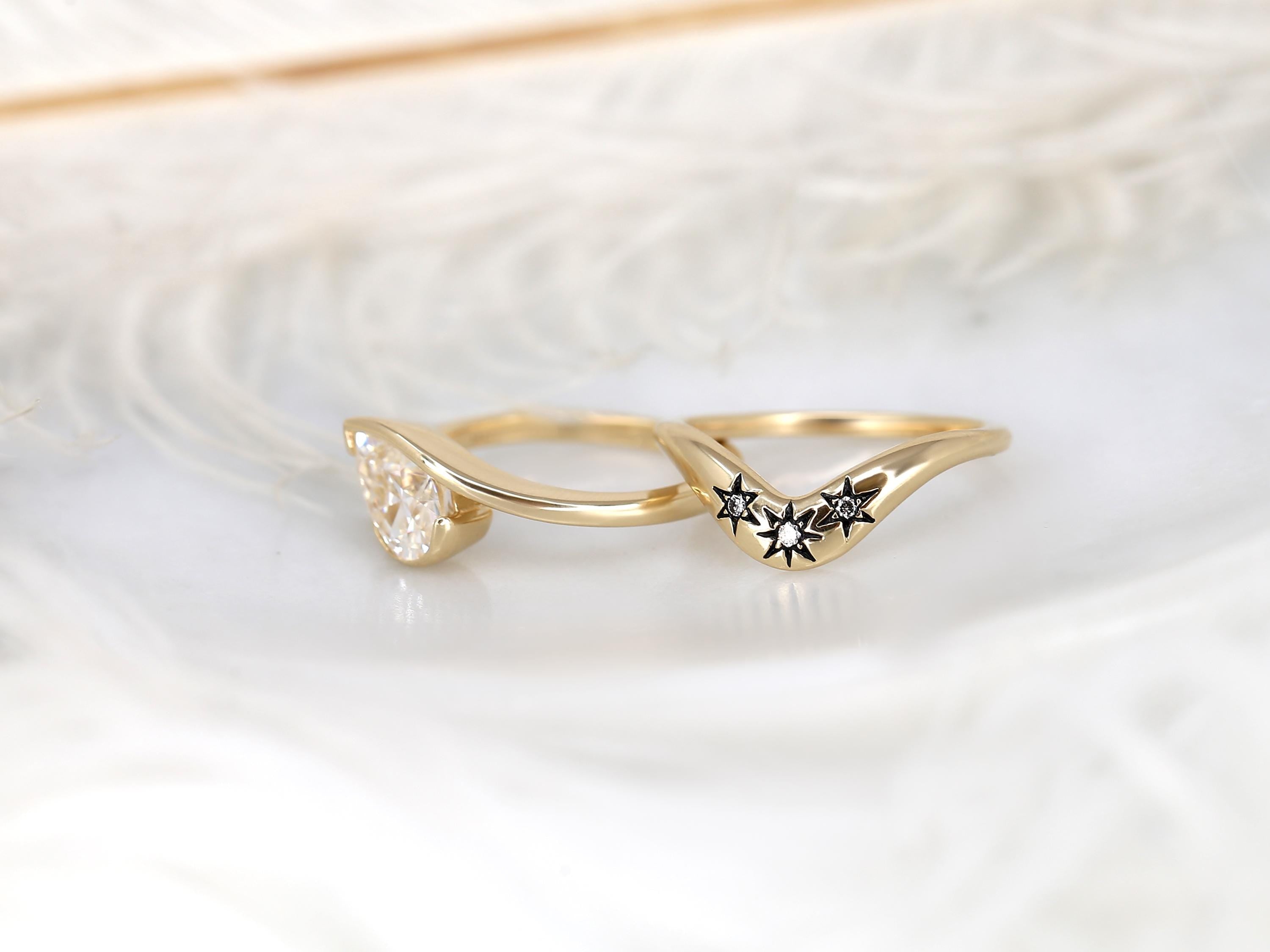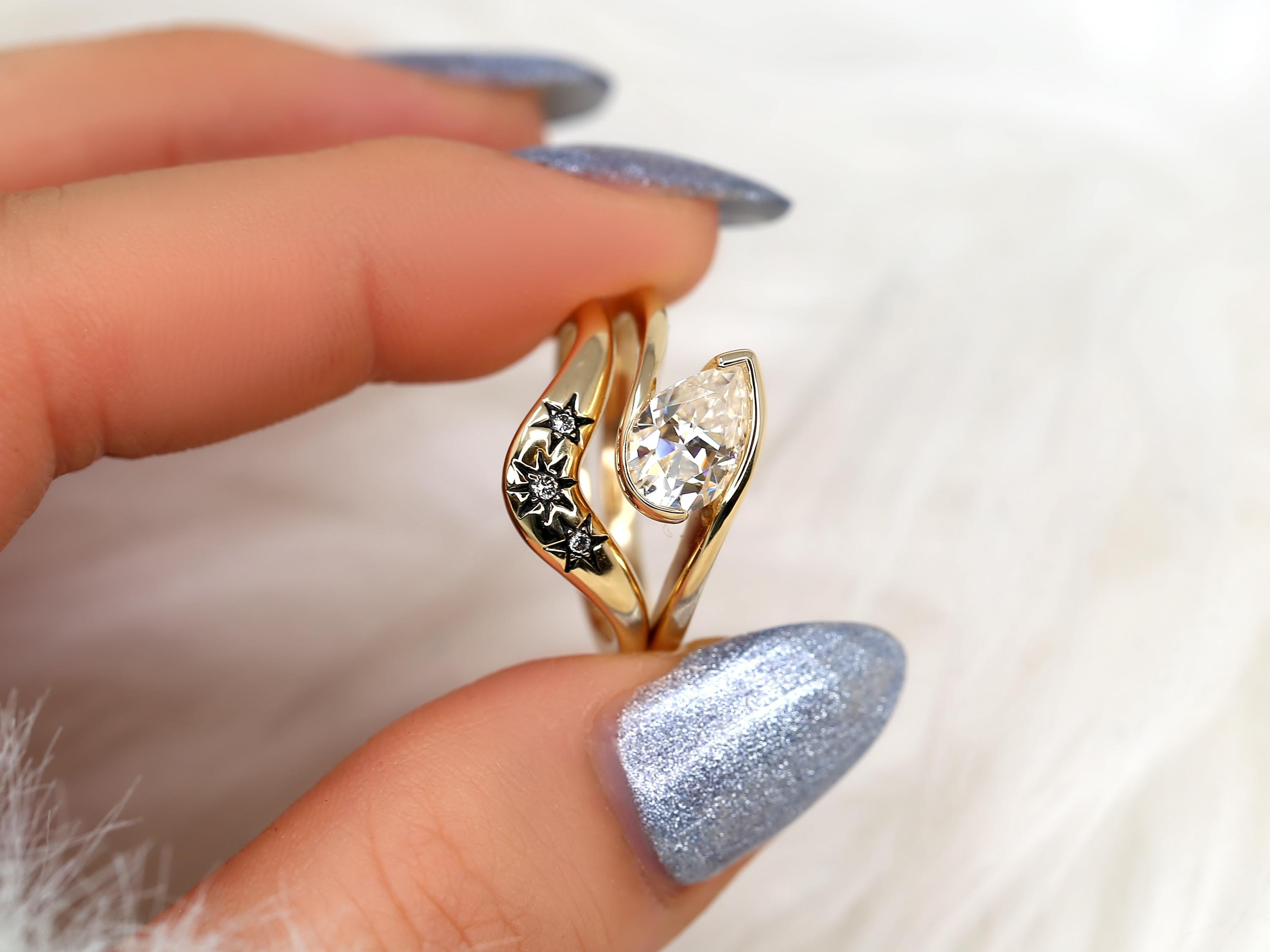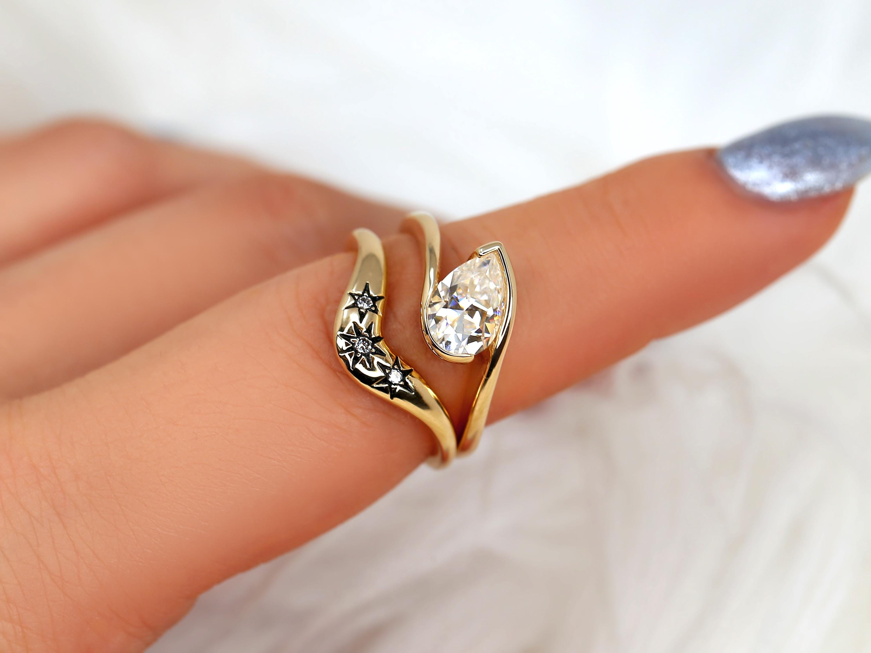 The Padme & Ursa engagement ring set centers a 9x6mm pear cut moissanite set on a graceful tilt, creating a modern slanted pear solitaire with quiet drama. Paired with the Ursa nesting band, designed with three star motifs symbolizing past, present, and future, the set evokes a celestial night sky. Black rhodium details add an edgy, vintage-inspired finish. Offered in any color 14kt gold for customization. Don’t see what you love? Share your vision and we can design from scratch.