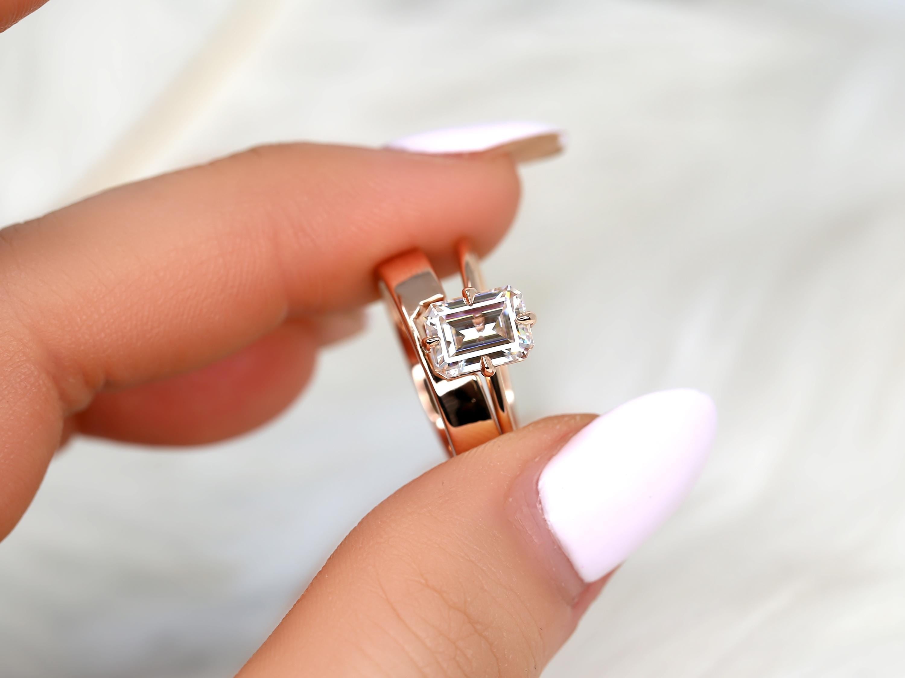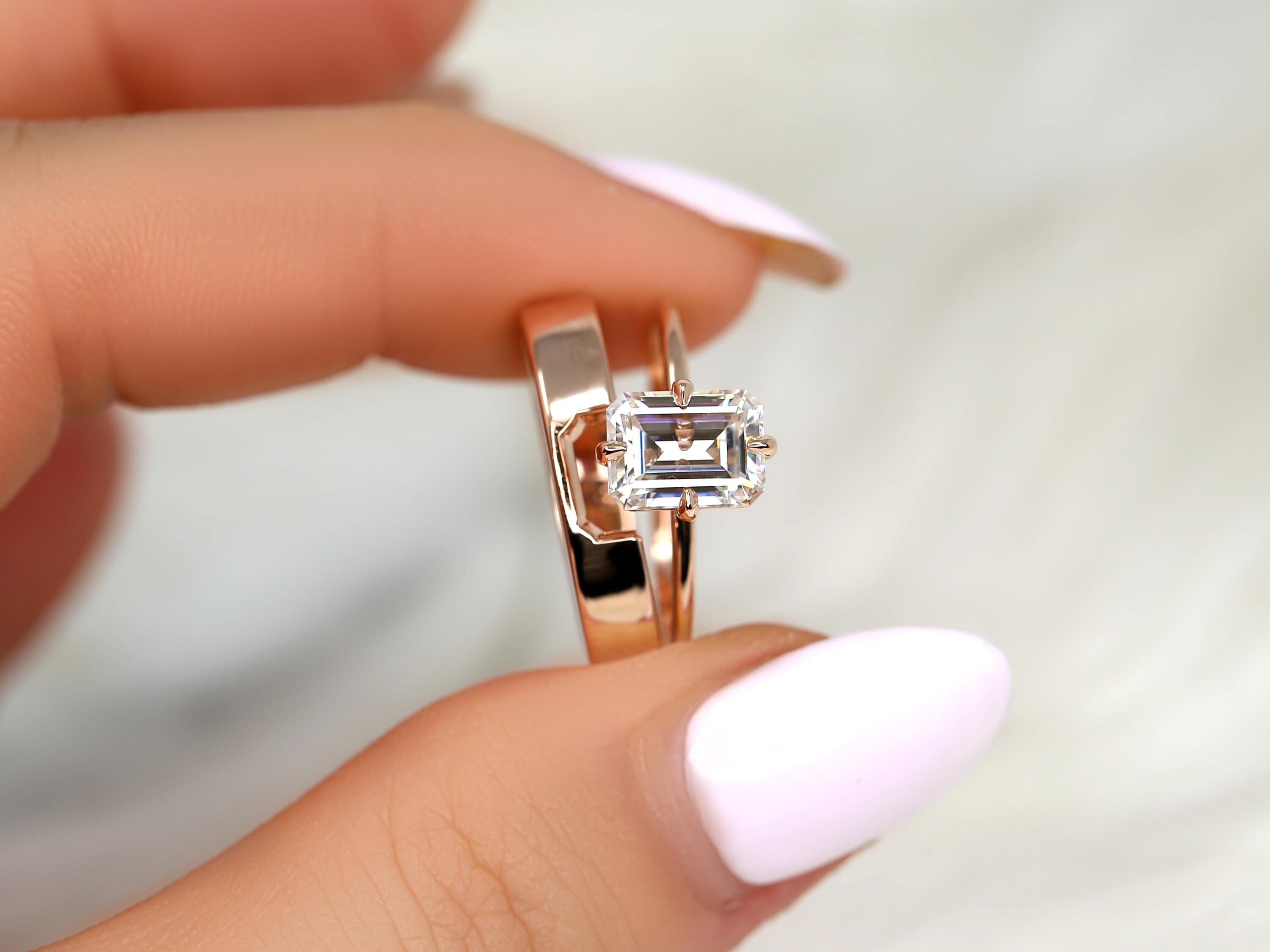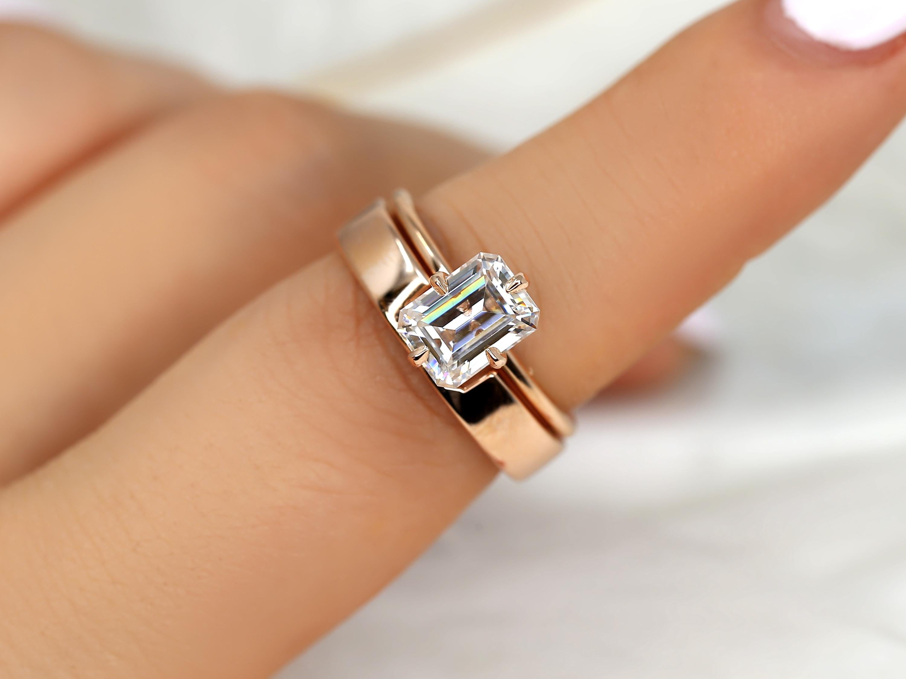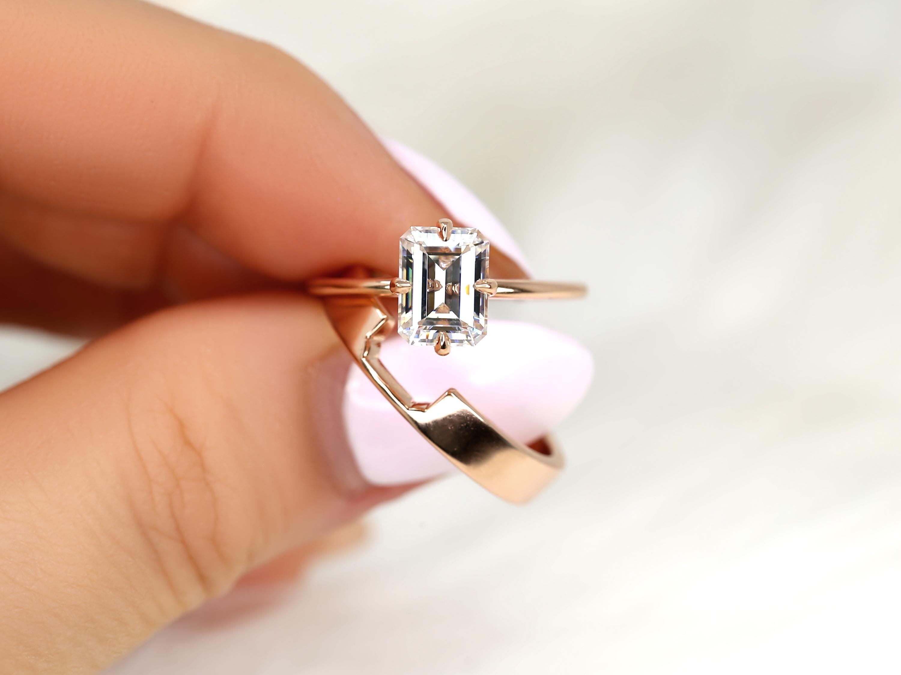 The Ruth & Codi bridal set centers an 8x6mm emerald cut moissanite set in the Ruth solitaire, designed with compass-set talon prongs and an ultra dainty gold band for a refined, modern look. Paired with a custom Codi notched wedding band, the two rings sit seamlessly together for bold, architectural balance. Offered in any color 14kt gold for customization. Don’t see exactly what you’re looking for? Share your vision and we can design a set from scratch.