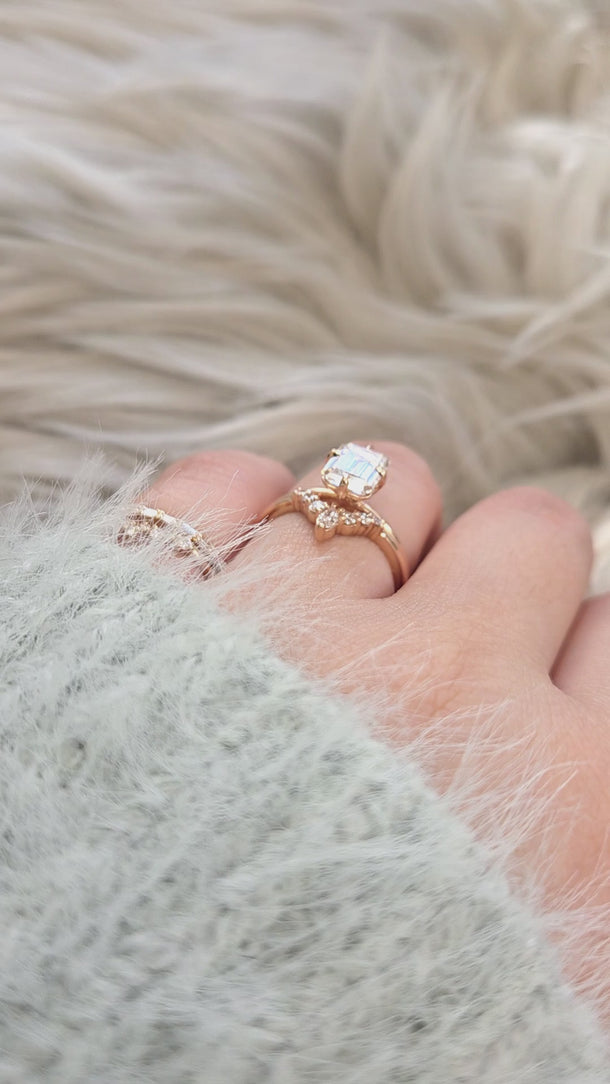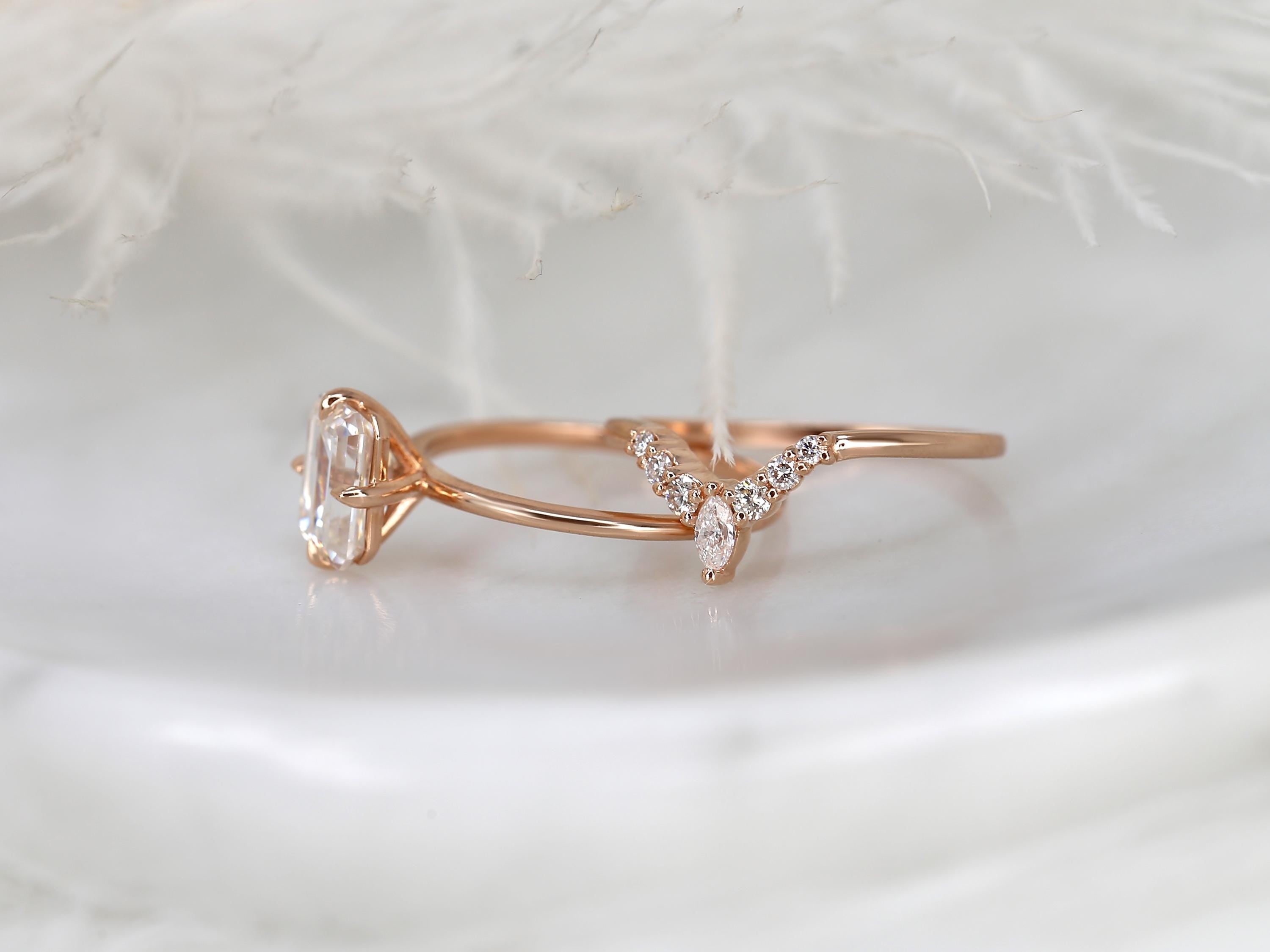 The Ruth & Kendall bridal set blends timeless elegance with Art Deco flair. A dainty 8x6mm emerald cut moissanite sparkles in the Ruth solitaire, while the Kendall nesting band—adorned with pear and round diamonds—curves gracefully around the center stone. Handcrafted in 14kt gold, available in any color.