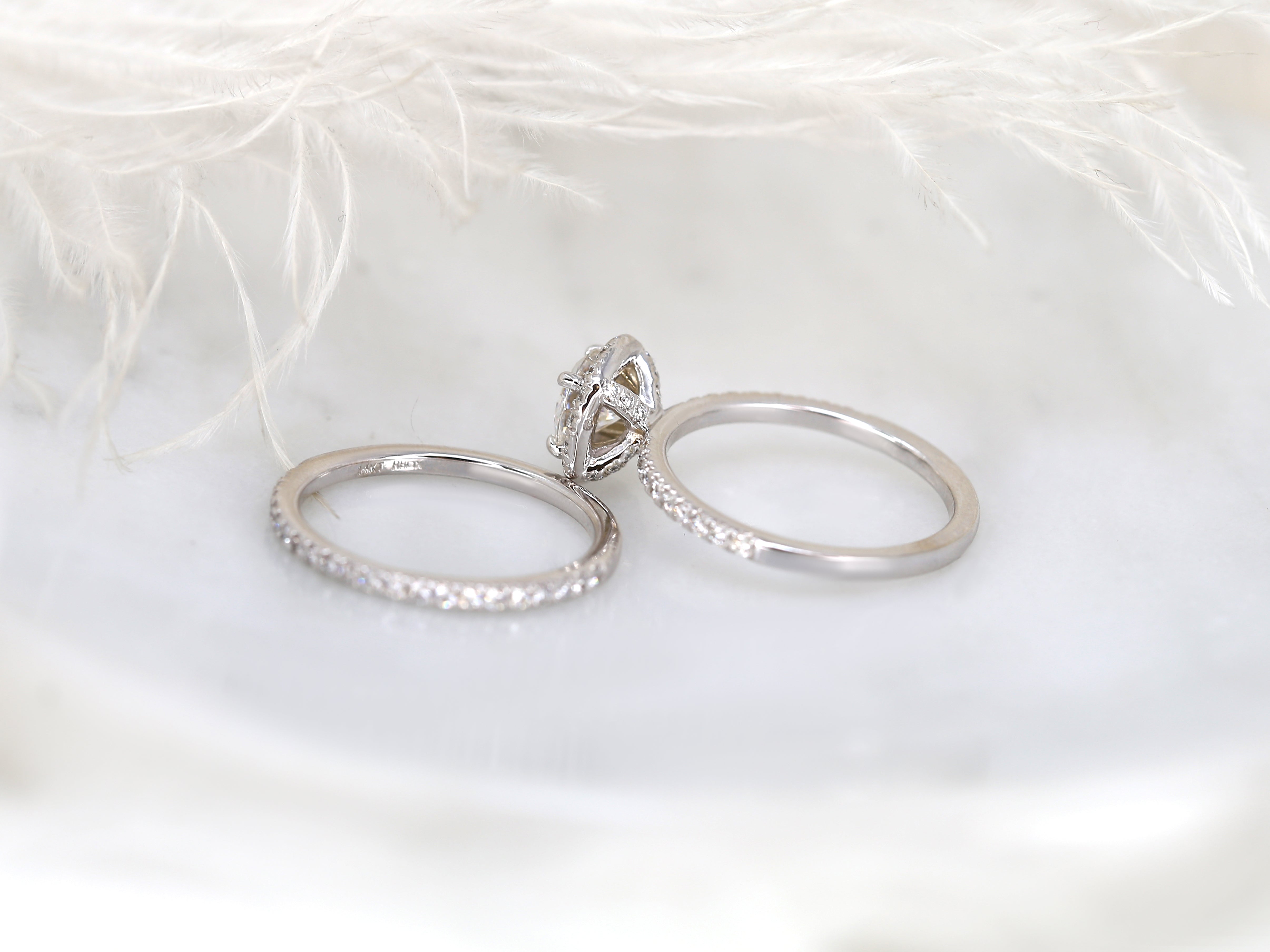 The Callie bridal set shimmers with timeless beauty. A 6.5mm round moissanite sparkles at the heart of a diamond halo, with pavé stones flowing halfway down the shank. Beneath the basket, hidden diamonds add a secret glimmer, while the non-cathedral mounting keeps the silhouette graceful and refined. Paired with a matching pavé diamond band, this set is a radiant duet of light. Offered in 14kt gold in your chosen color, each piece is handcrafted in our Chicago studio.