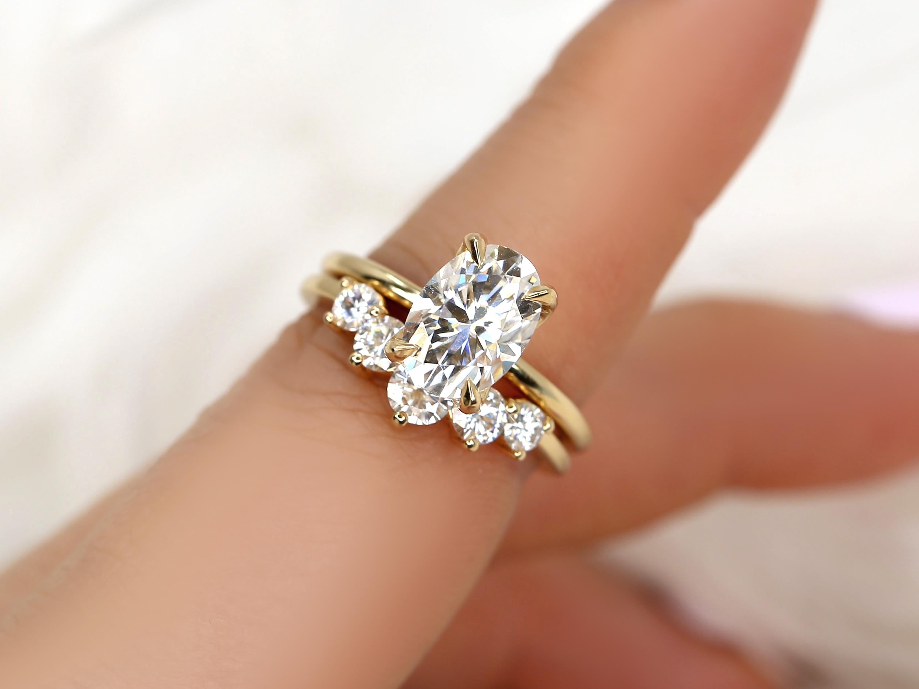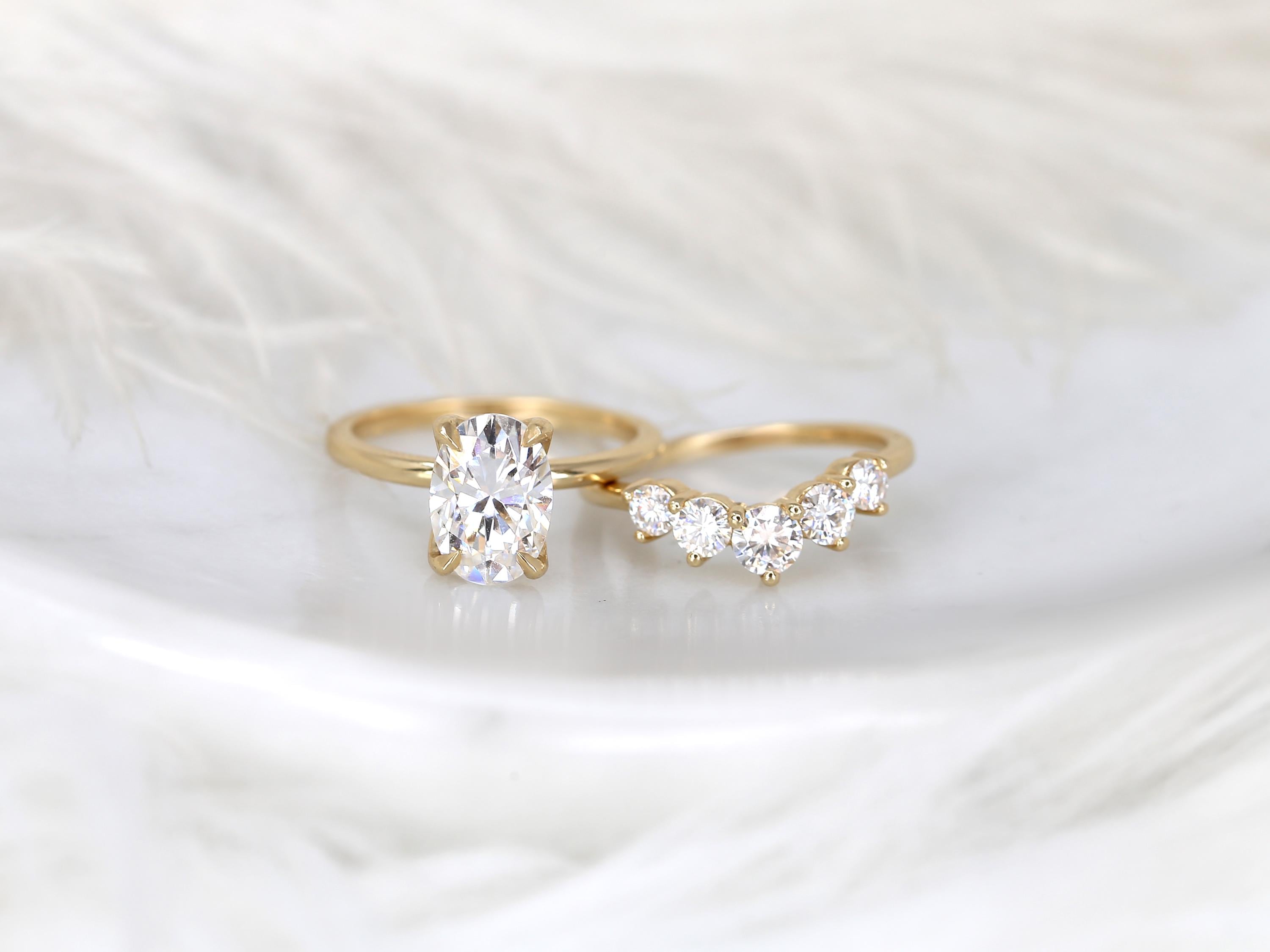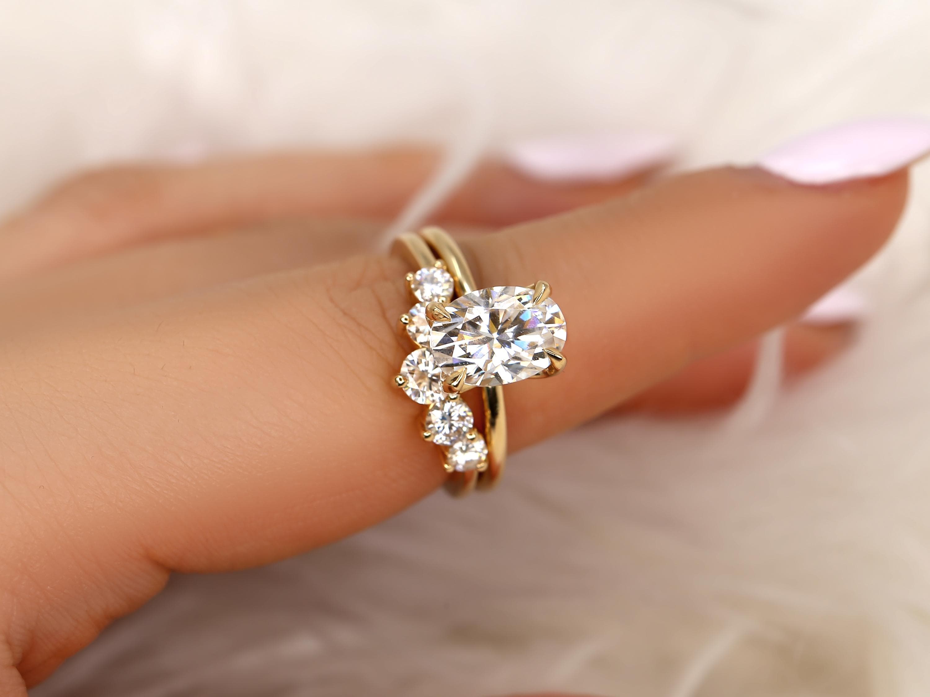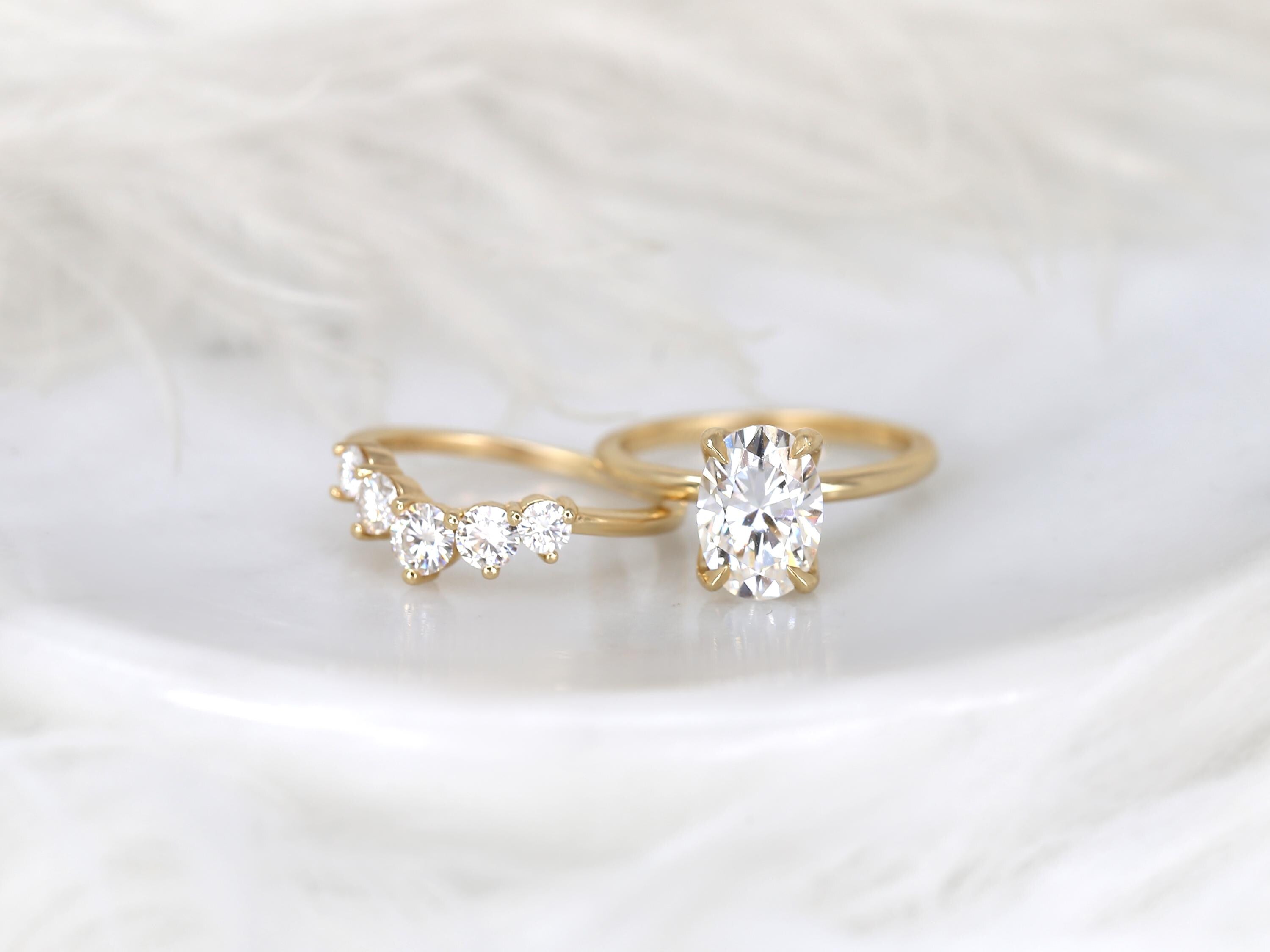 The Phoebe & Glen bridal set features a 10x7mm elongated oval moissanite set in the Phoebe engagement ring, designed with a minimalist floral basket and dainty gold band for a refined look. Paired with a bold five-stone nesting ring that curves gracefully around the solitaire, this set feels both bold and classy. Offered in any color 14kt gold for customization. Don’t see what you love? Share your vision and we can design from scratch.