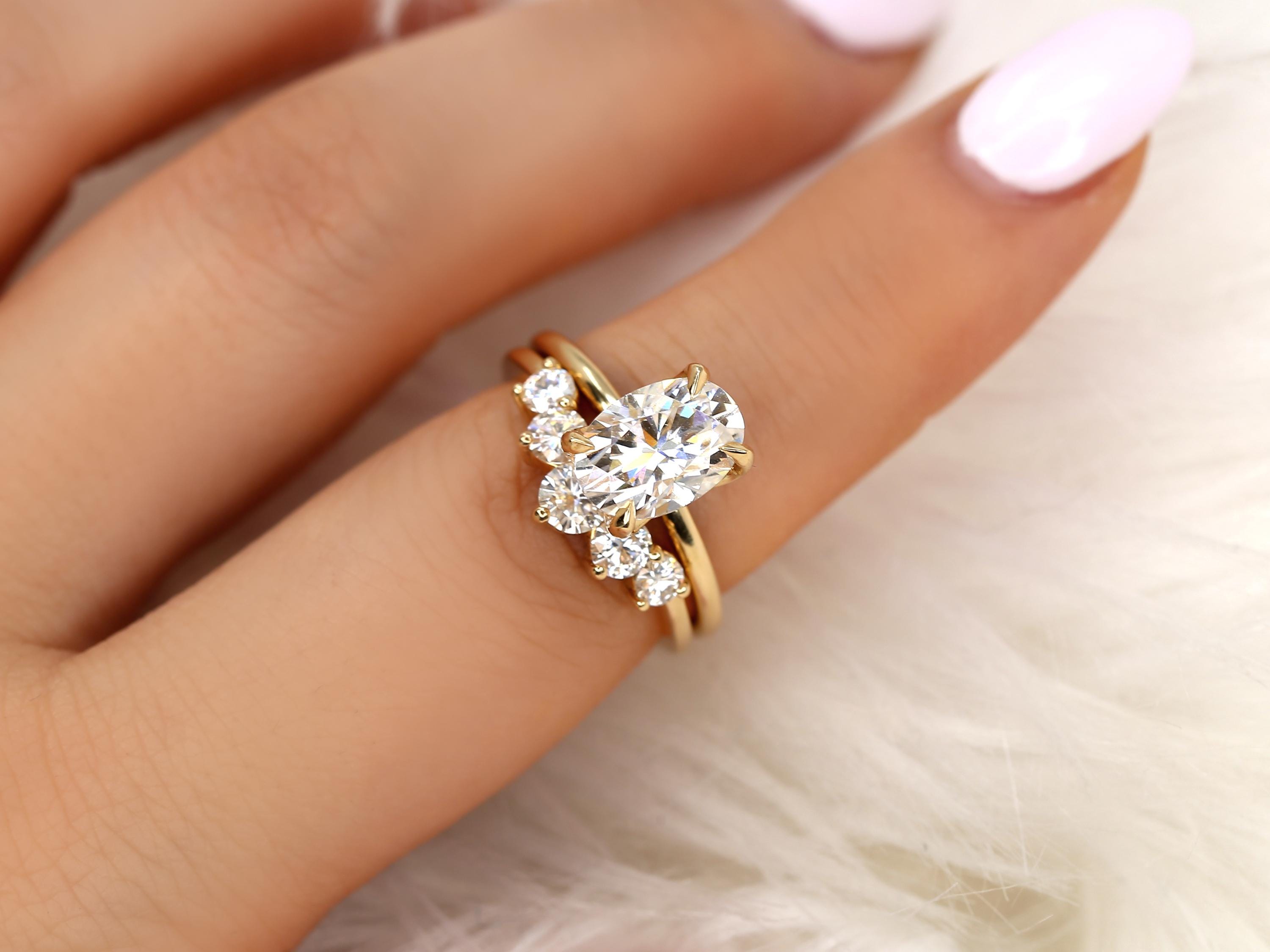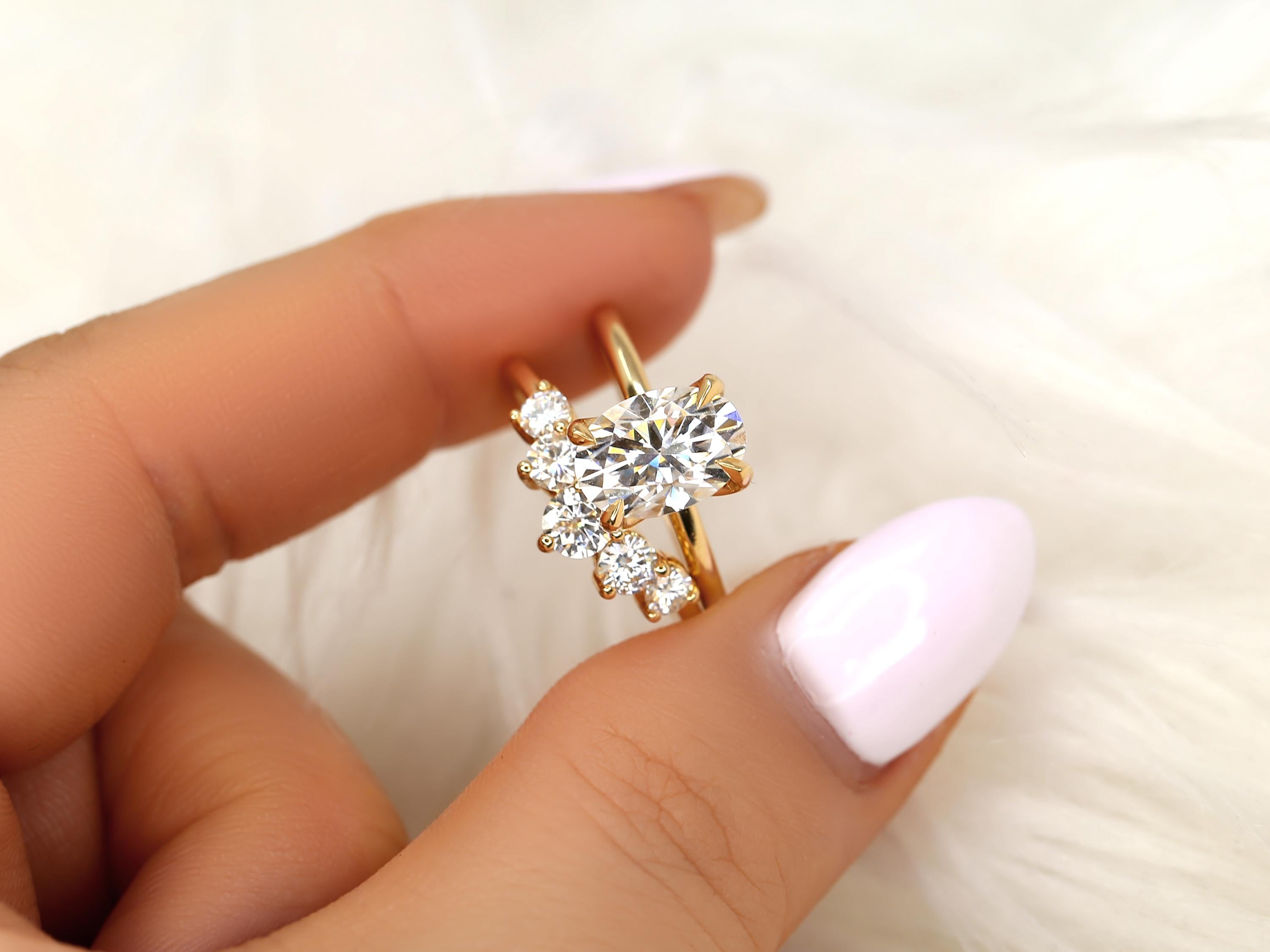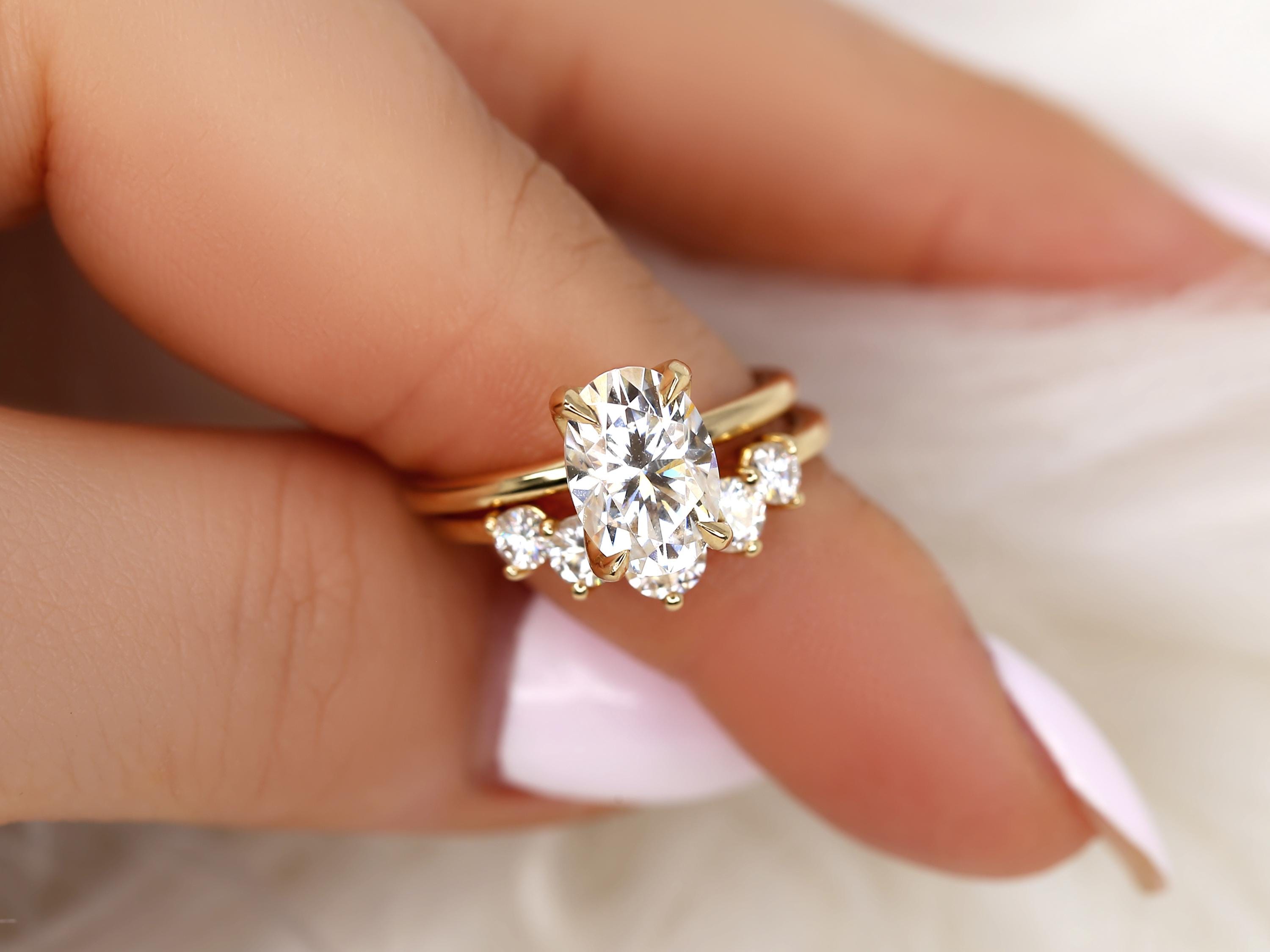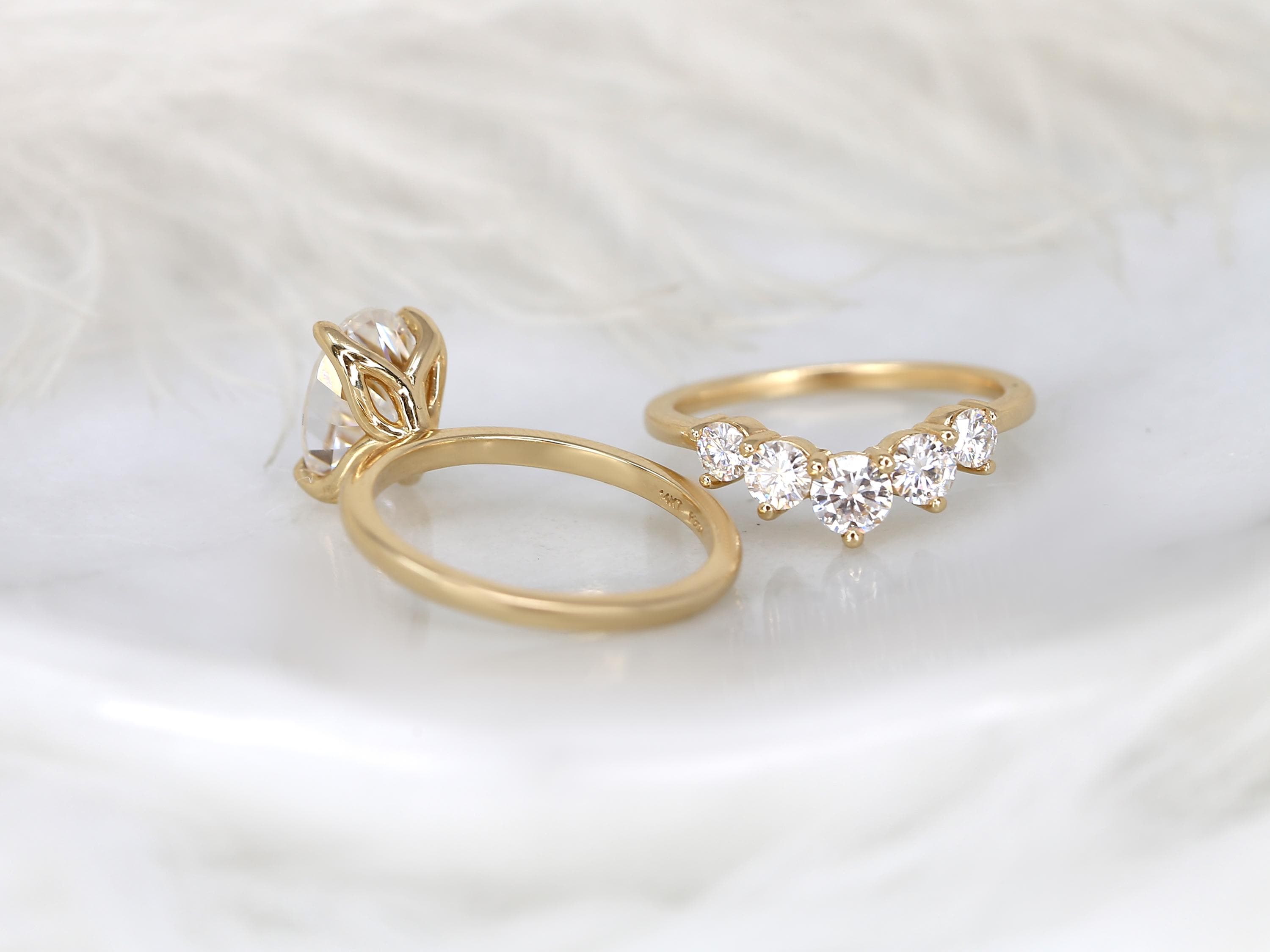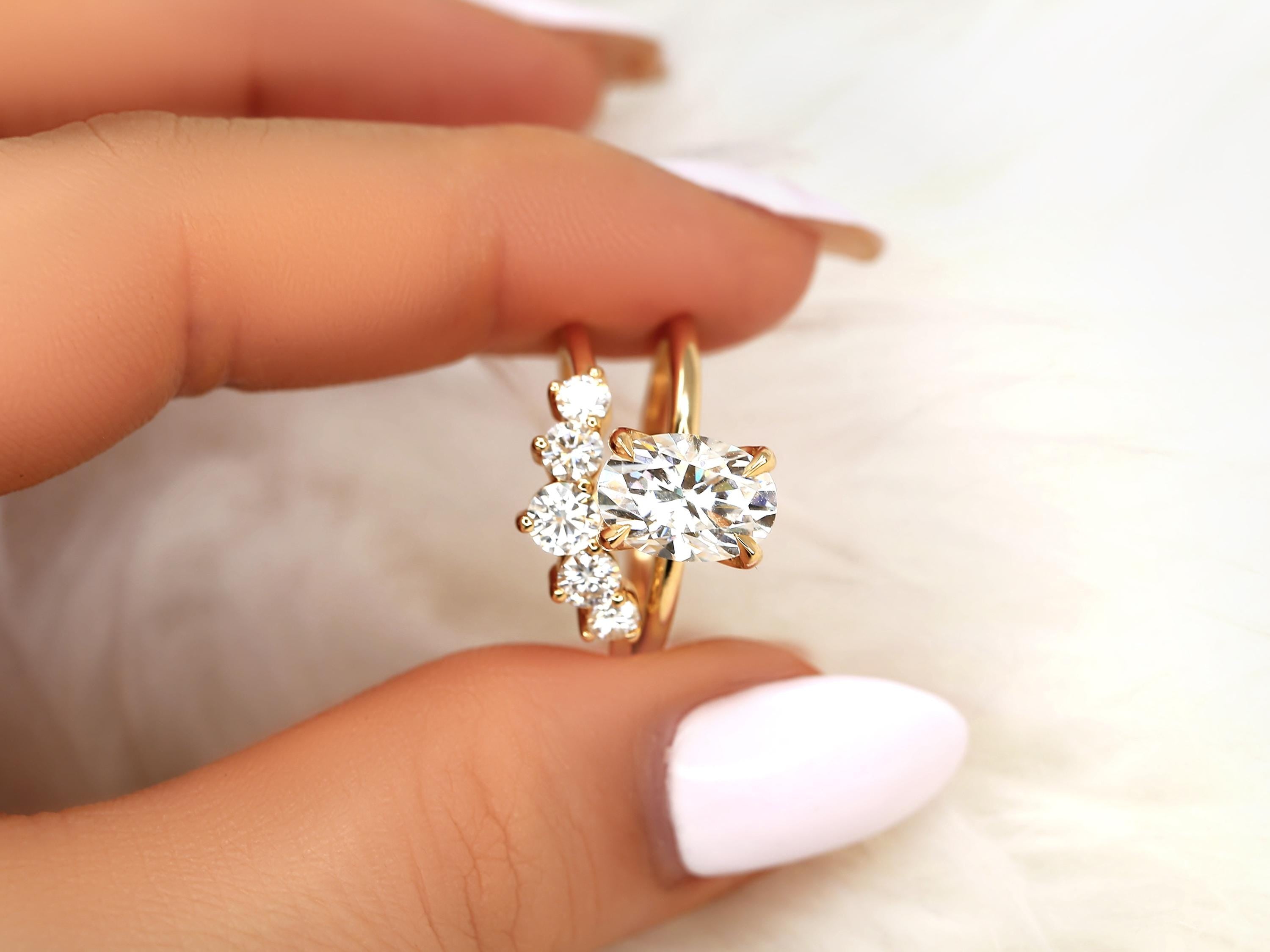 The Phoebe & Glen bridal set features a 10x7mm elongated oval moissanite set in the Phoebe engagement ring, designed with a minimalist floral basket and dainty gold band for a refined look. Paired with a bold five-stone nesting ring that curves gracefully around the solitaire, this set feels both bold and classy. Offered in any color 14kt gold for customization. Don’t see what you love? Share your vision and we can design from scratch.