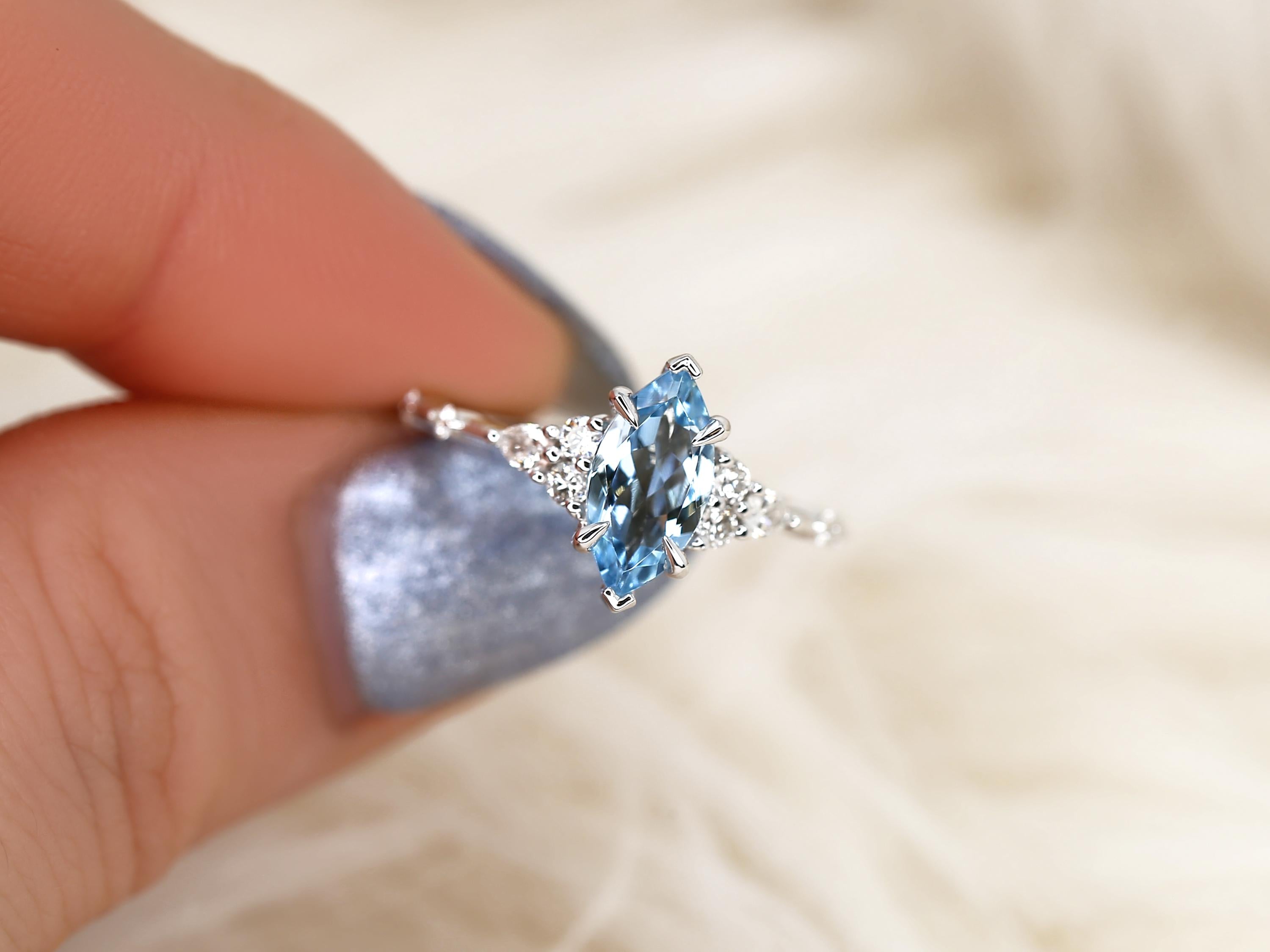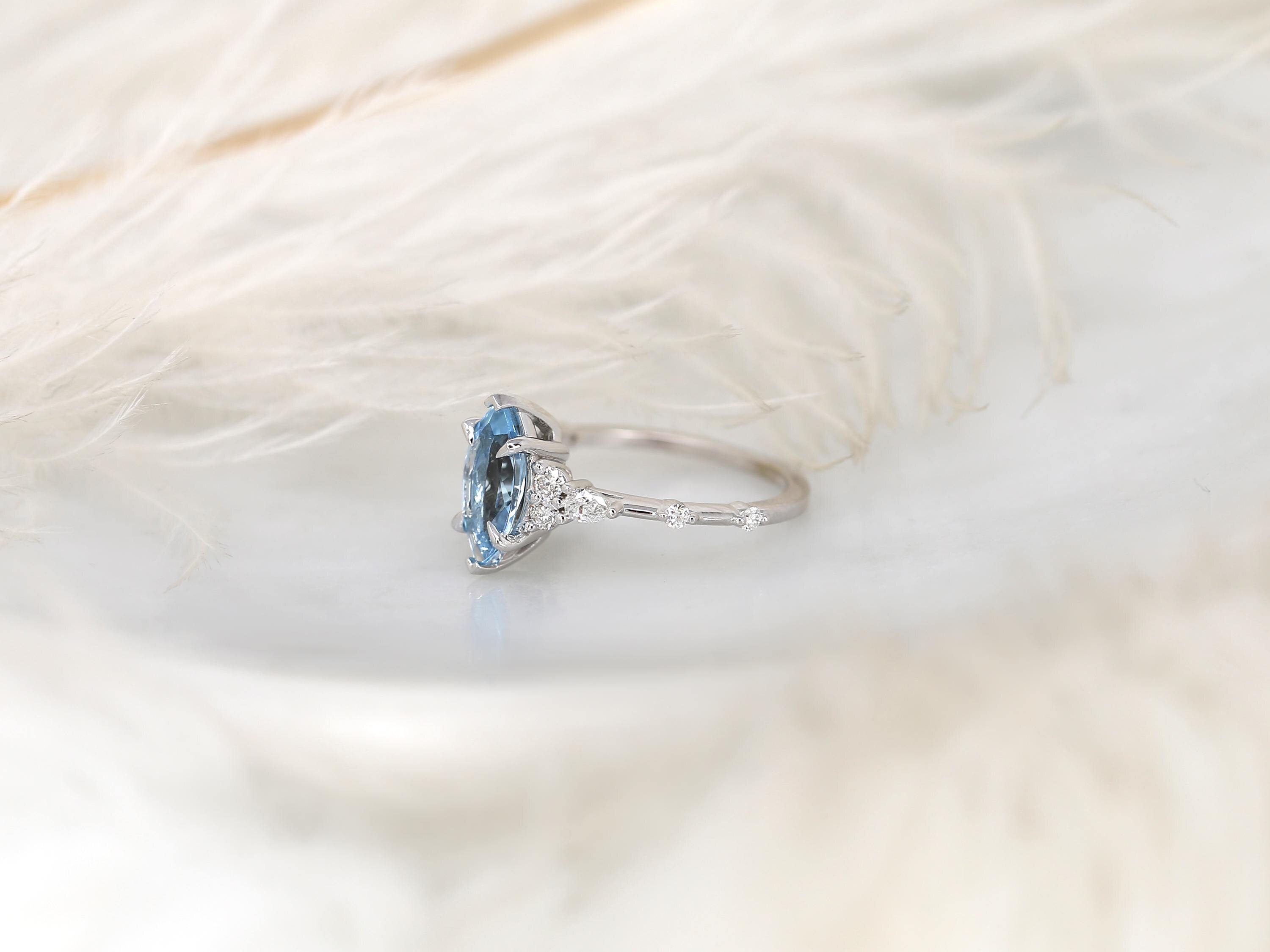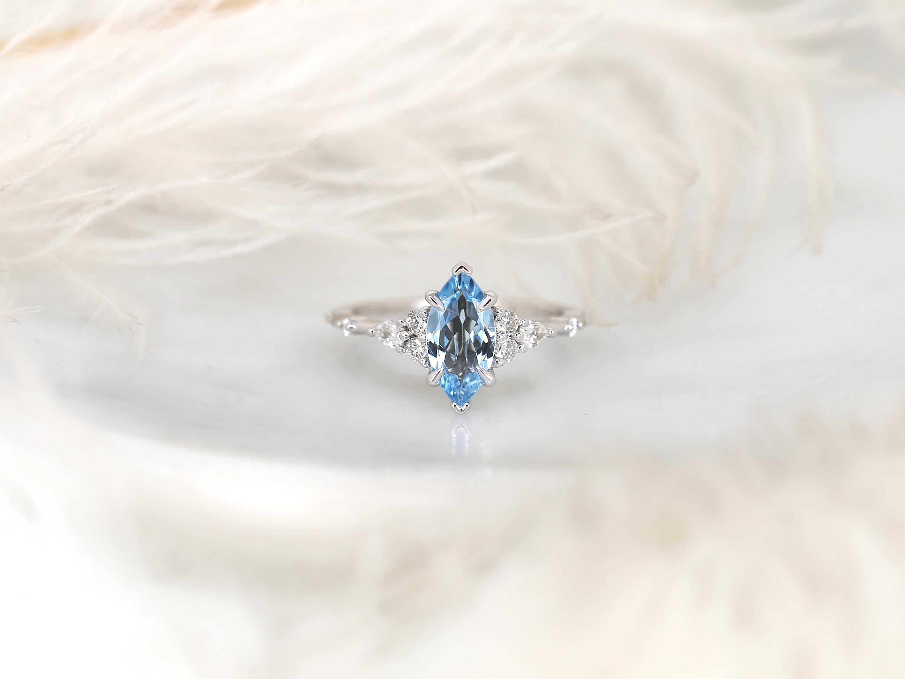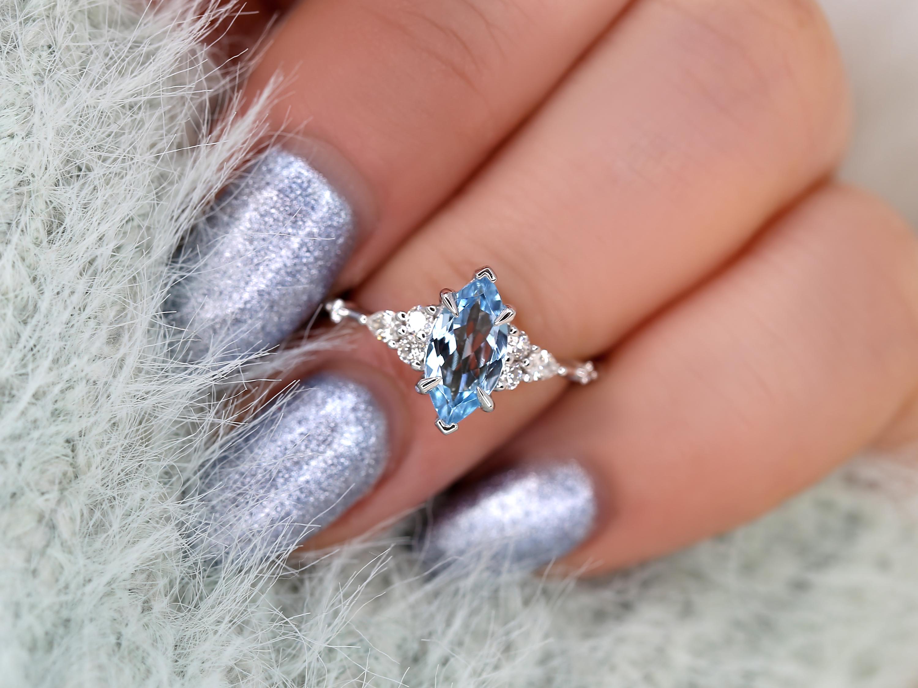 The Astrid ring features a 10x5mm marquise aquamarine set in an Art Deco-inspired cluster design that enhances its serene blue tone. Diamonds spaced along the shank create a delicate winter effect, adding airy sparkle without overwhelming the center stone. Crafted in 14kt gold, this elongated silhouette feels both vintage and modern. A meaningful March birthstone engagement ring, anniversary gift, or distinctive statement piece with timeless beauty.