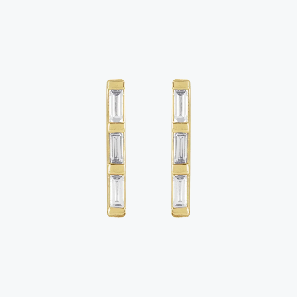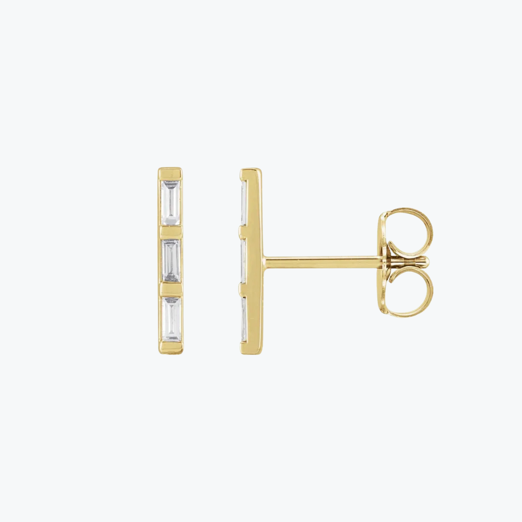 The Bernice Diamond Stud Earrings offer a sleek, modern twist on a classic silhouette—each earring features three baguette-cut diamonds set in a clean bar-set style, creating a line of sparkle that feels both contemporary and refined. Designed to be worn solo or as a second piercing, these versatile studs transition effortlessly from day to night. Handmade in the USA in your choice of 14kt rose, yellow, or white gold, they’re a timeless staple for everyday elegance or meaningful gifting.