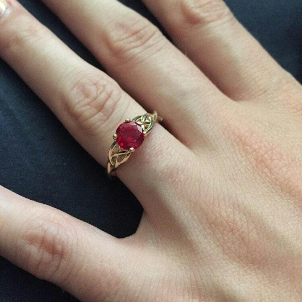 Honor your love story with our Ruby Cassidy Engagement Ring, featuring a vivid ruby center stone embraced by a Celtic knot triquetra design. Handmade in your choice of 14K gold color for lasting beauty.