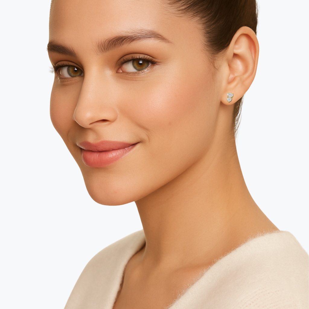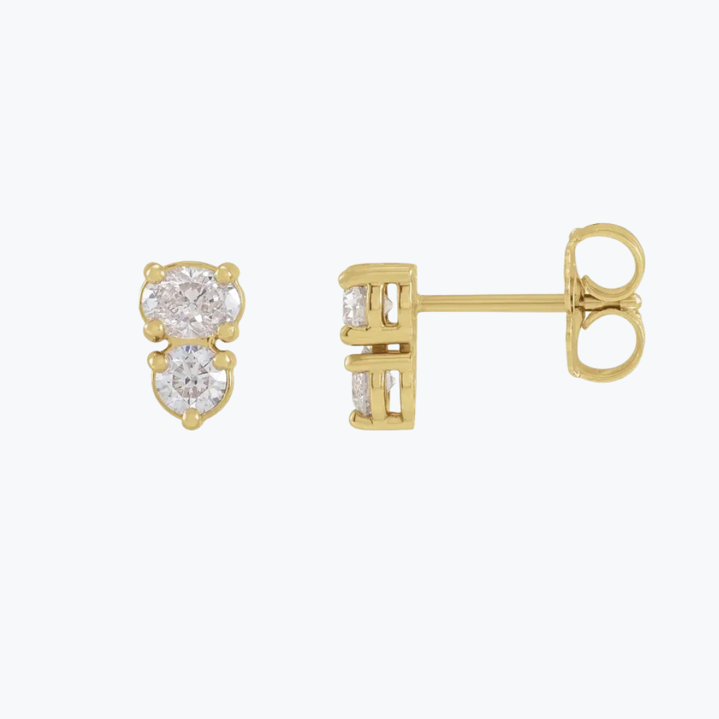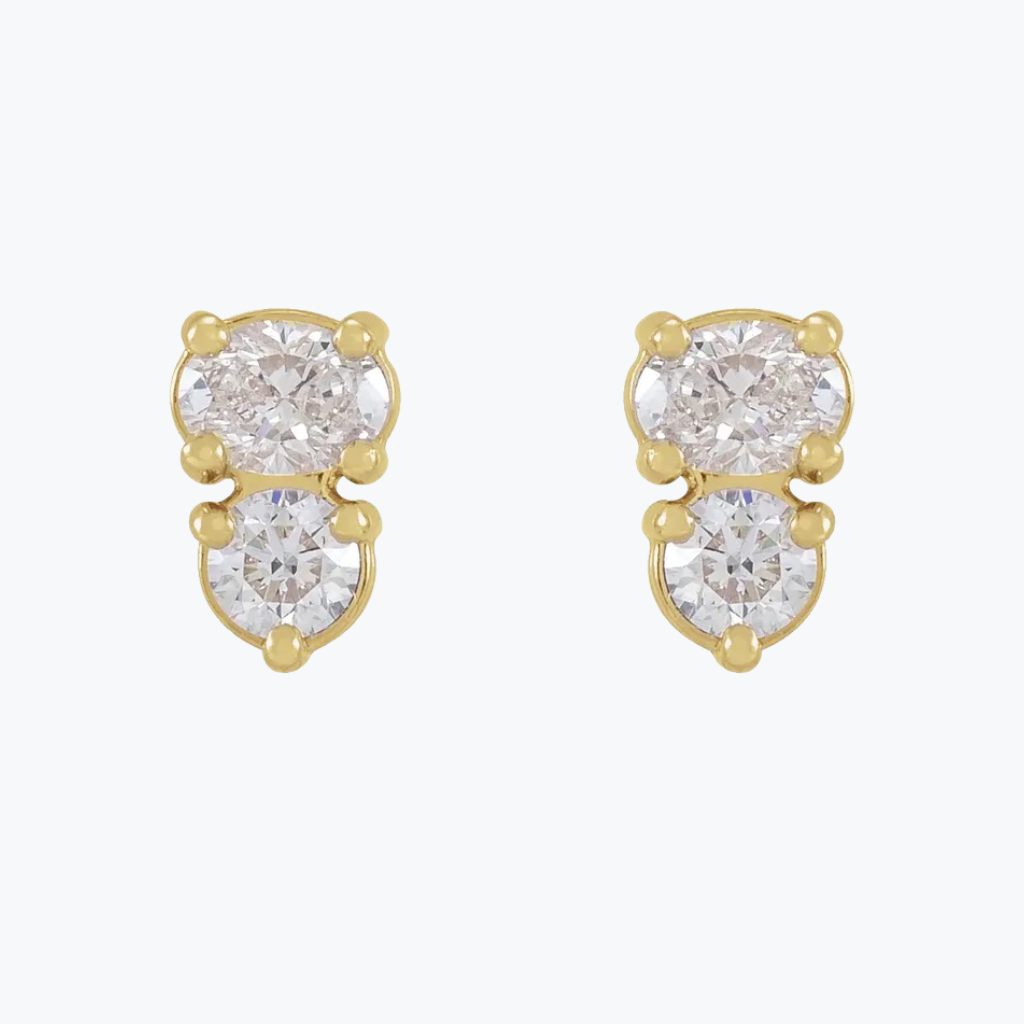 The Didra Two-Stone Diamond Stud Earrings are a fresh, modern take on the classic solo stud. Featuring a round and oval cut diamond paired side by side in elegant prong settings, these earrings bring a touch of asymmetrical charm and sparkle. Handmade in the USA in your choice of 14kt rose, white, or yellow gold, Didra is perfect for minimalist styling or layering with other earrings to create your own unique, personal look.