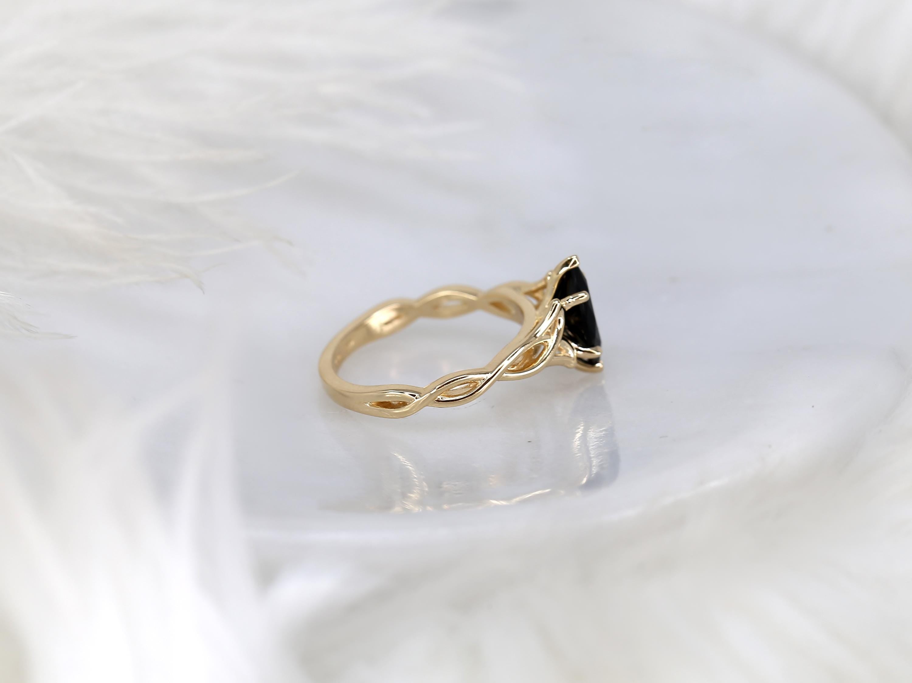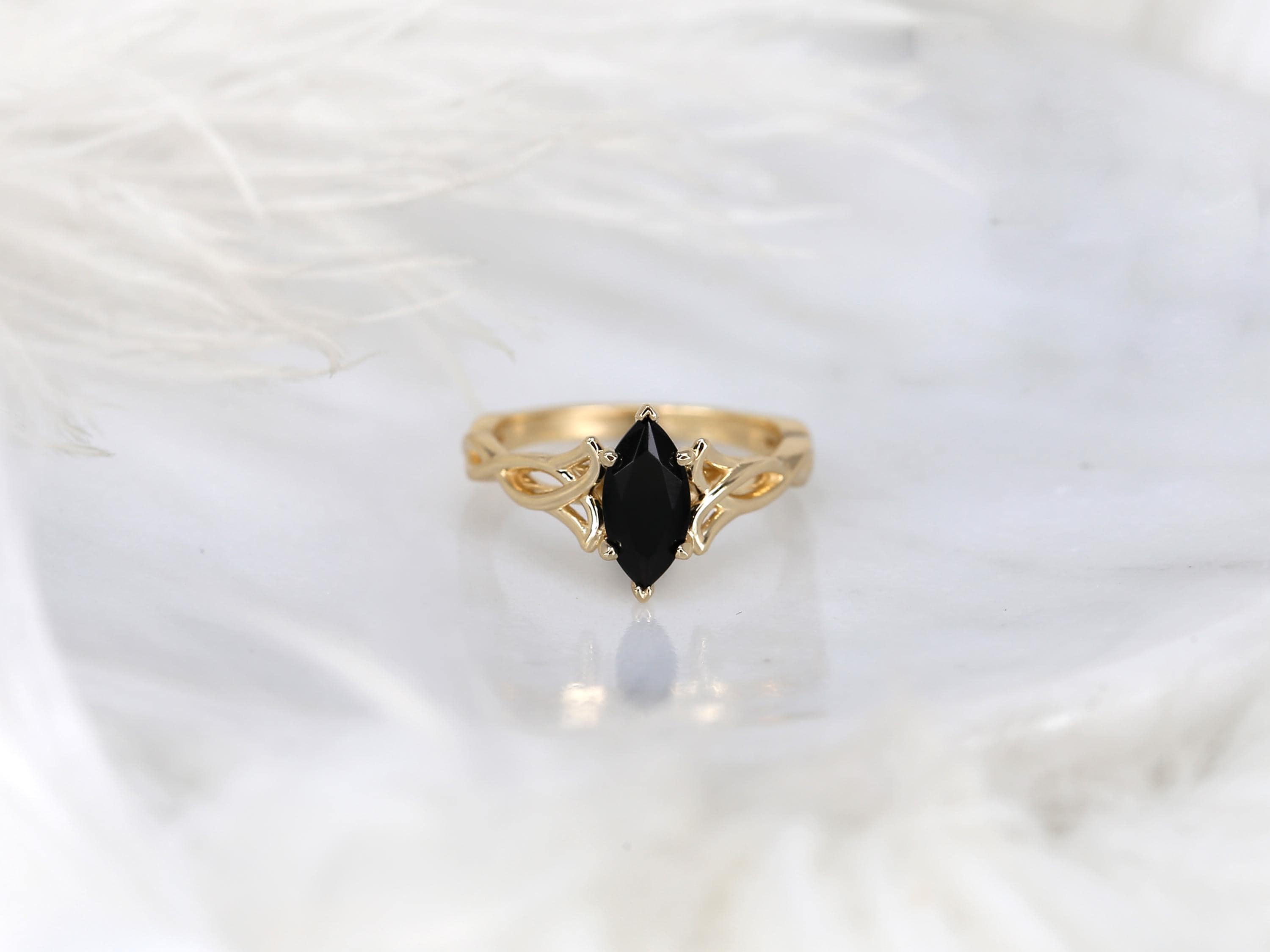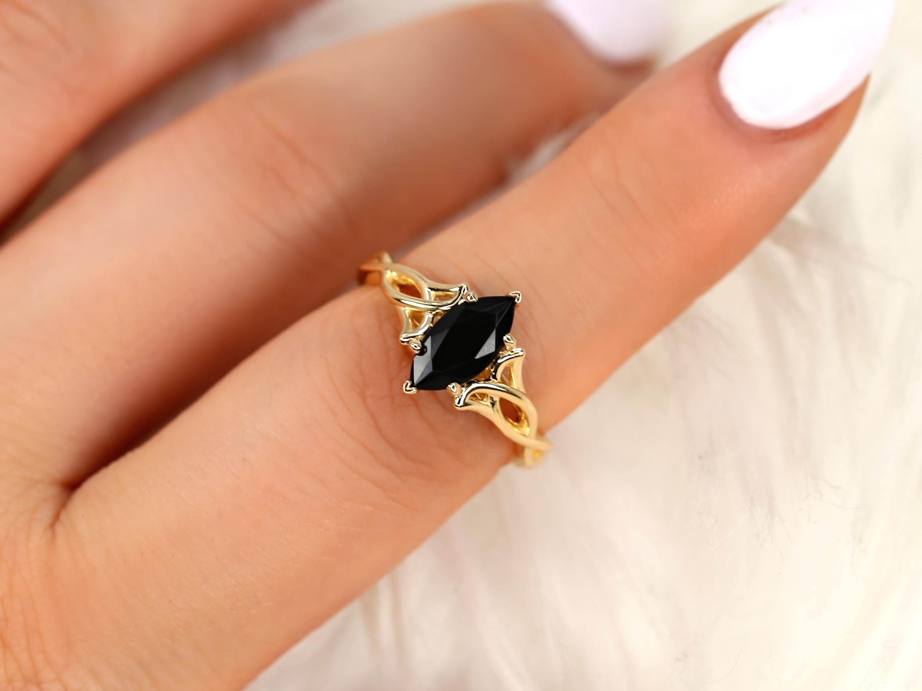 The Mara ring embodies bold elegance with a touch of mystique. A 10x5mm marquise-cut onyx rests at the center, its deep hue framed by a graceful Celtic triquetra-inspired twist. The braided gold design weaves together strength and eternity, creating a ring that feels both ancient and modern. Elegant, eccentric, and effortlessly sophisticated, this design channels gothic romance with timeless artistry. Available in 14kt gold in the color of your choice, each piece is handcrafted in our Chicago studio.