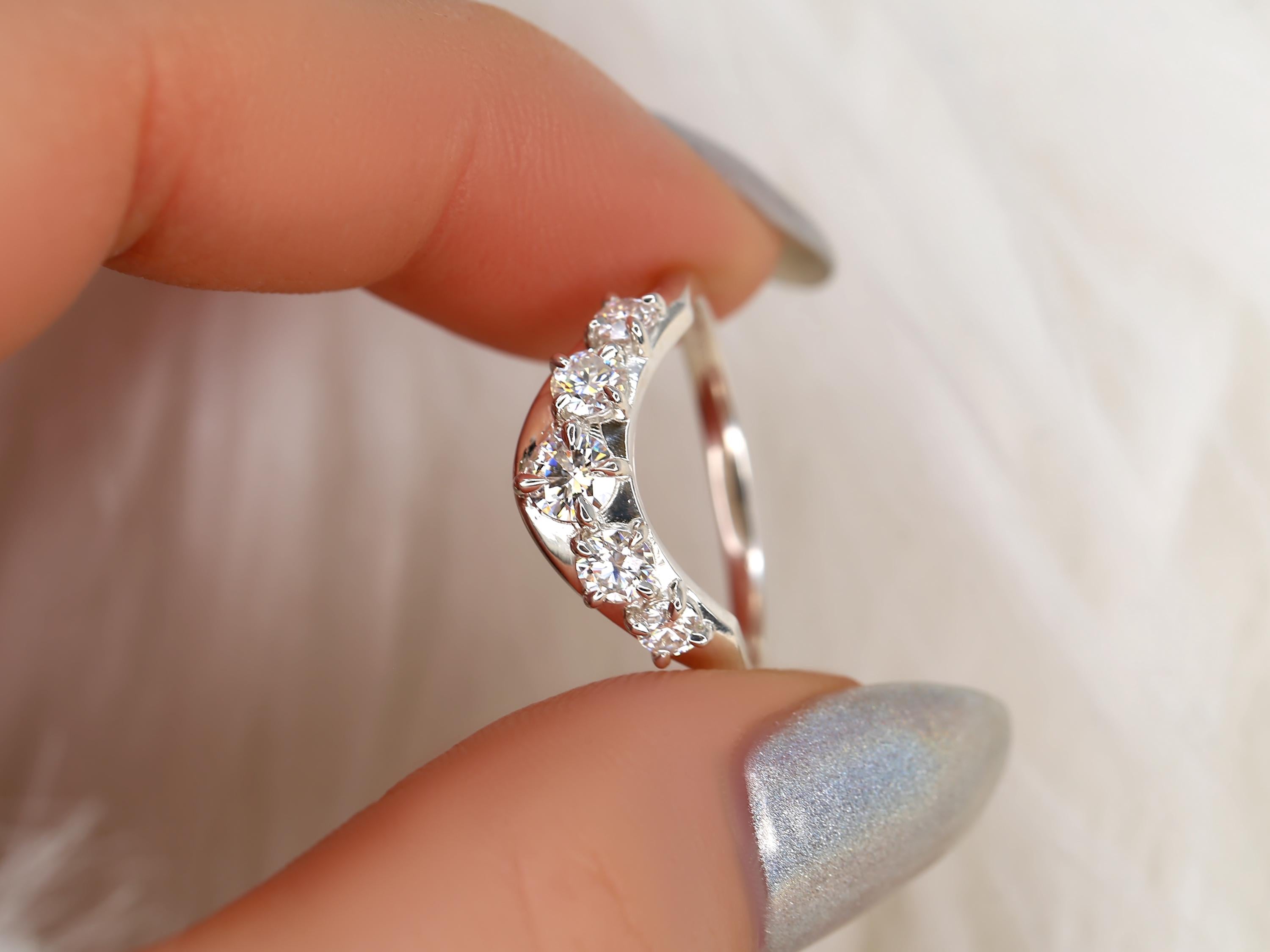 A bolder take on our beloved Saldana, this graduated diamond nesting band sweeps into a deeper curve, embracing your solitaire with edgy sophistication. Five striking stones rest in a geometric collar, creating a modern, sculptural silhouette that pairs beautifully with solitaires or low-profile rings. Crafted in your choice of 14kt gold, this statement band brings bold elegance to any stack.