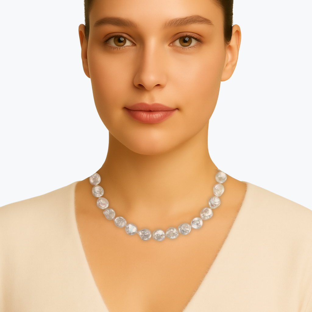 The Organic Coin Pearl Necklace is bold elegance with natural grace. Each 13–14mm pearl reveals soft tones of white, blush rose, and silvery sheen, its organic surface adding unique character to every piece. Strung on an 18-inch strand with a flat silver clasp, it is striking worn alone yet versatile enough to layer for modern sophistication. Adjustable lengths are available upon request, making this necklace a timeless treasure for any collection.