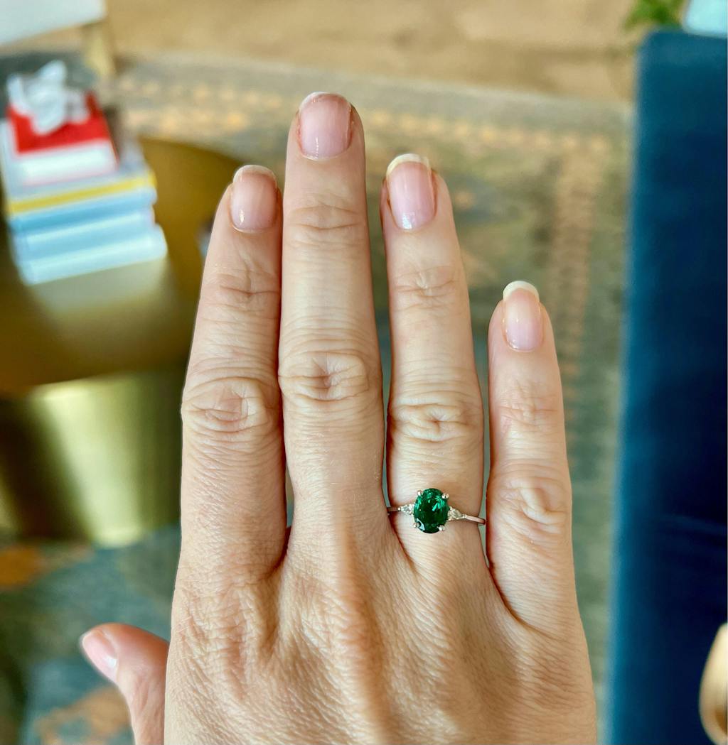 Petite Emery 8x6mm 14kt Gold Emerald Diamond Dainty Pear Oval Three Stone Ring