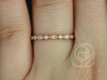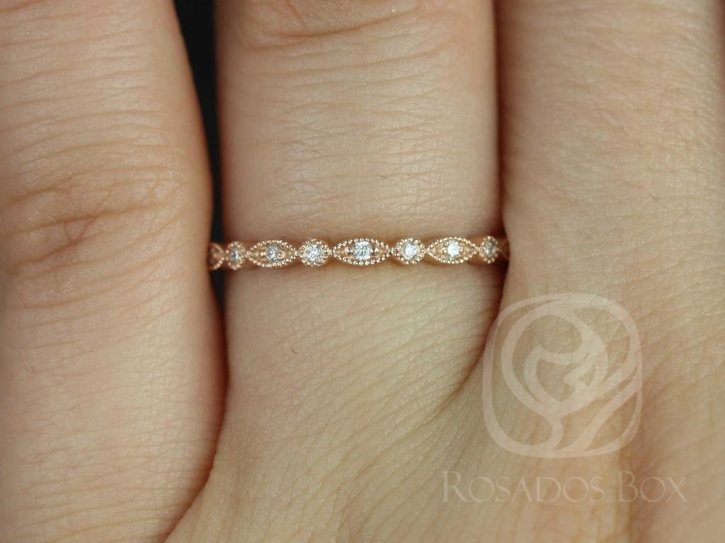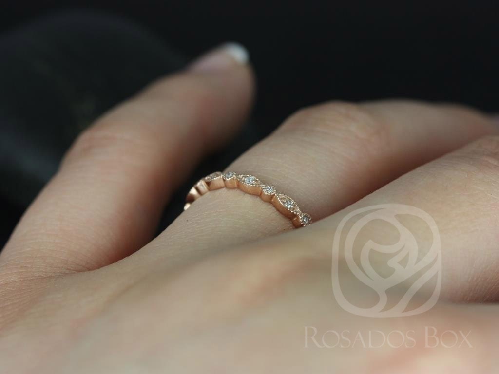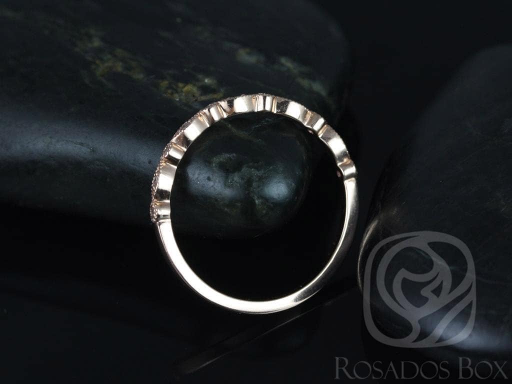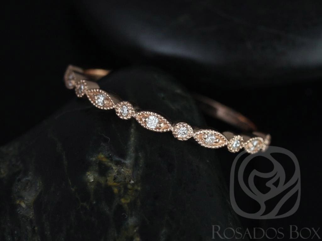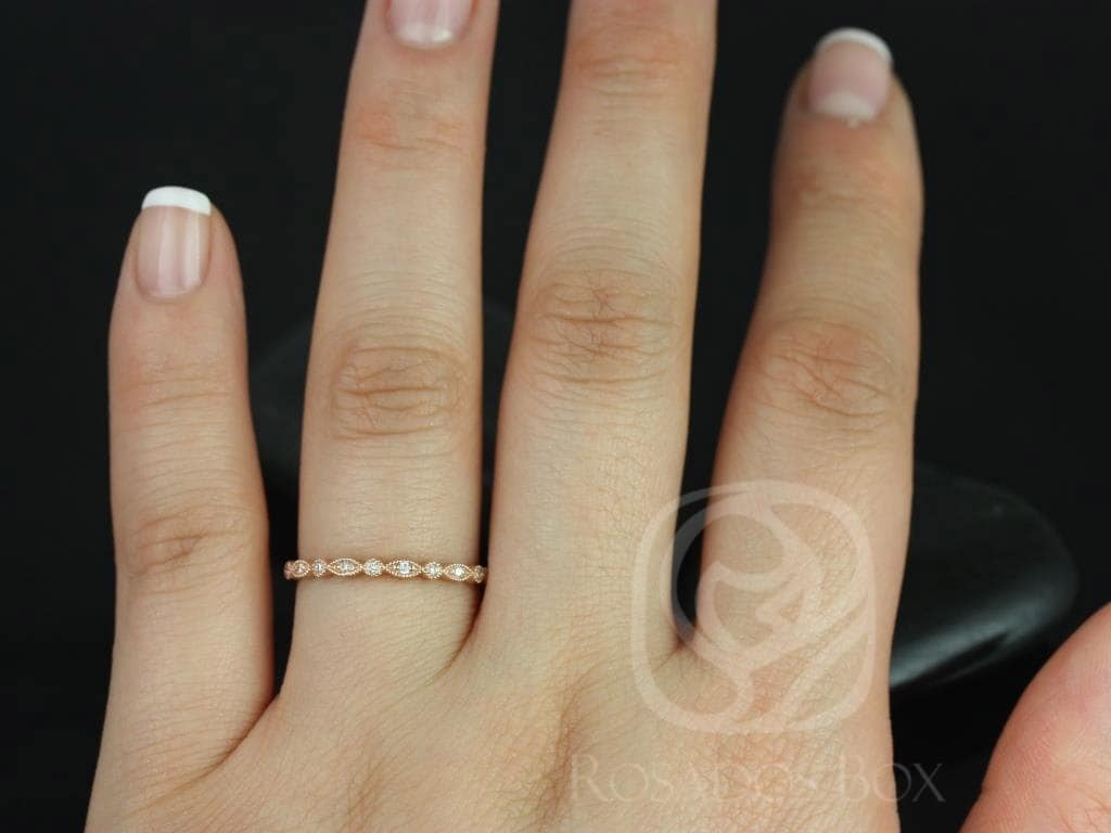 The Gwen Diamond Halfway Eternity Ring is a dainty vintage-inspired beauty, ready to ship in 14kt rose gold. This elegant band features sparkling diamonds set within delicate scalloped bezels, finished with fine milgrain detailing for an Art Deco touch. Perfect as a wedding band, stacking ring, or thoughtful gift, Gwen brings timeless sophistication and subtle sparkle to any jewelry collection.