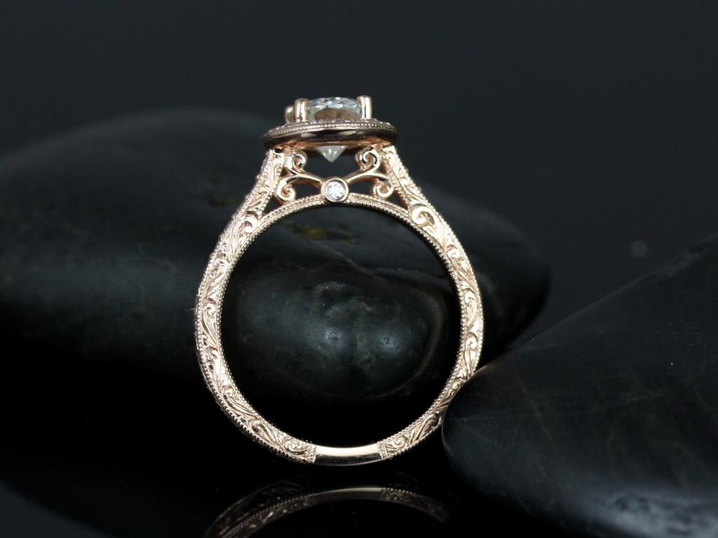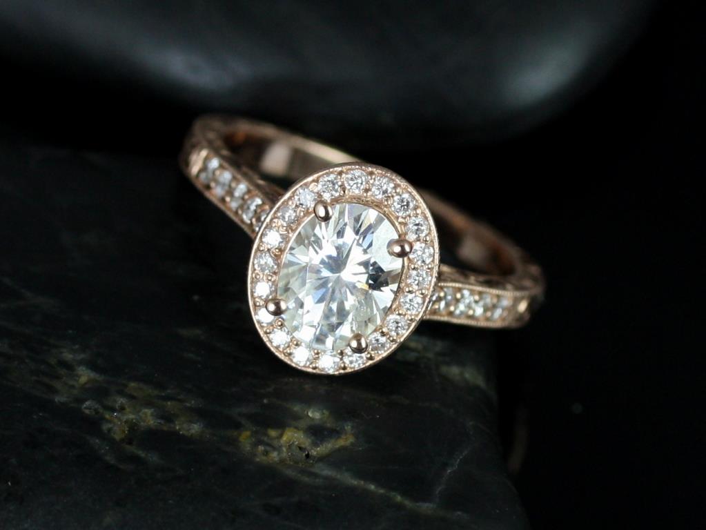 1.50ct Aurora 8x6mm 14kt Rose Gold FB Moissanite Diamonds Hand Engraved Oval Halo Bridal Set