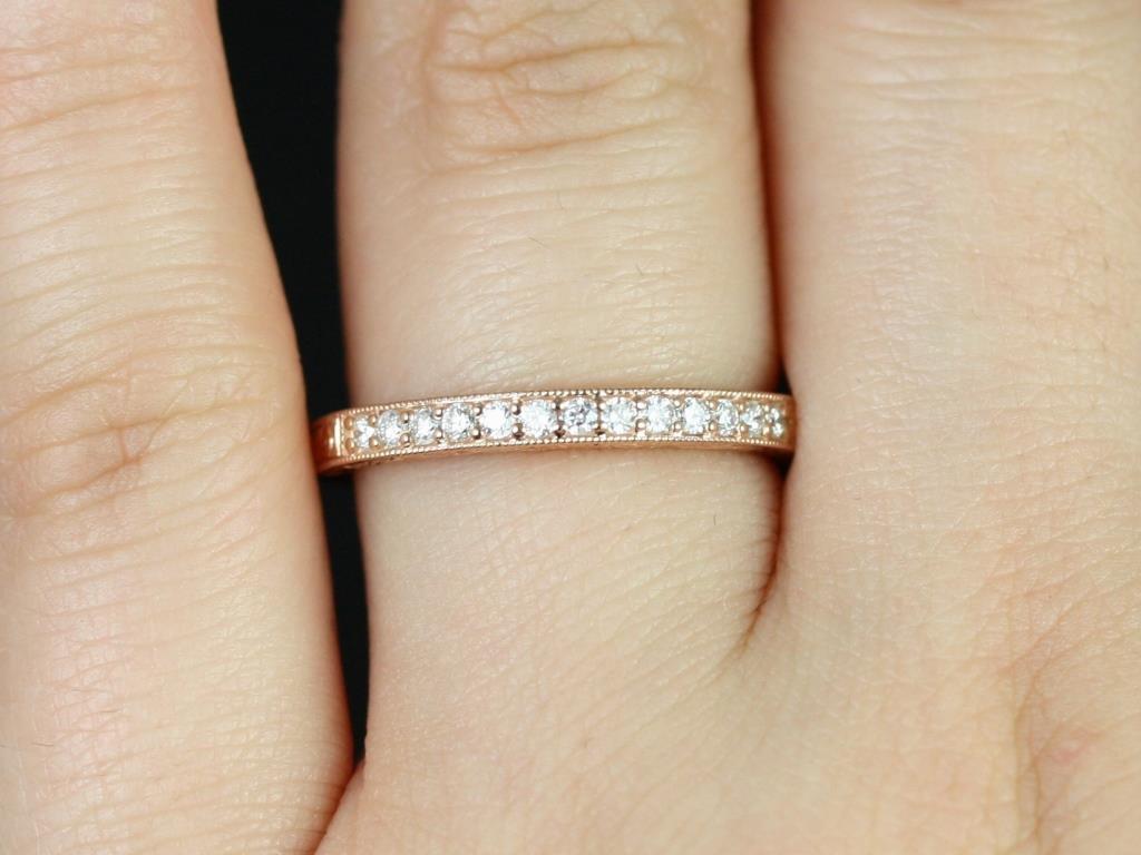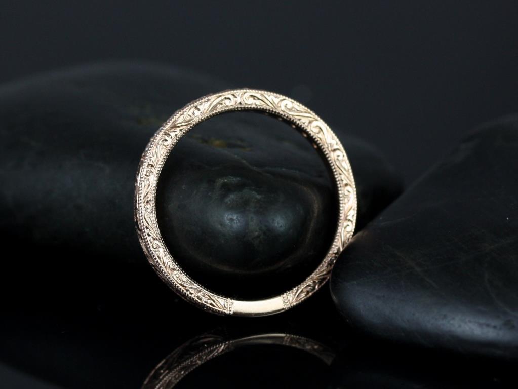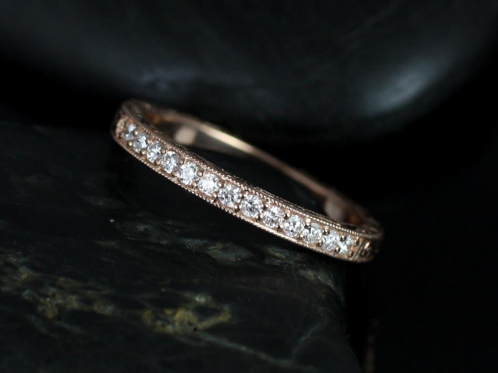 The Aurora engagement ring set features an 8x6mm oval Forever Brilliant moissanite framed by a bead-set diamond halo and pavé shank accented with delicate milgrain for a vintage touch. Hand-engraved curling wave details adorn the gallery of both rings, adding refined artistry throughout. Paired with a matching diamond wedding band set just short of halfway, this 14kt rose gold set offers timeless beauty with romantic detail. Ready to ship after sizing.